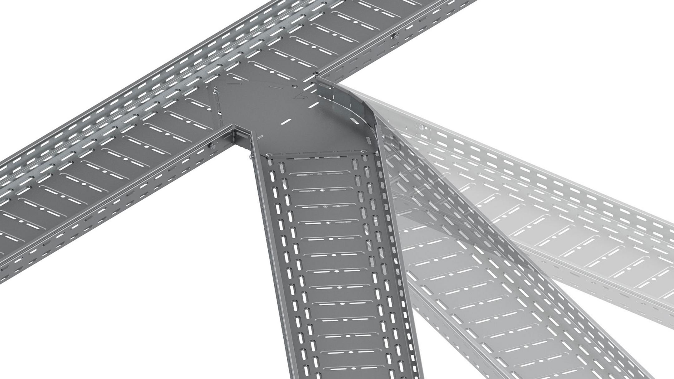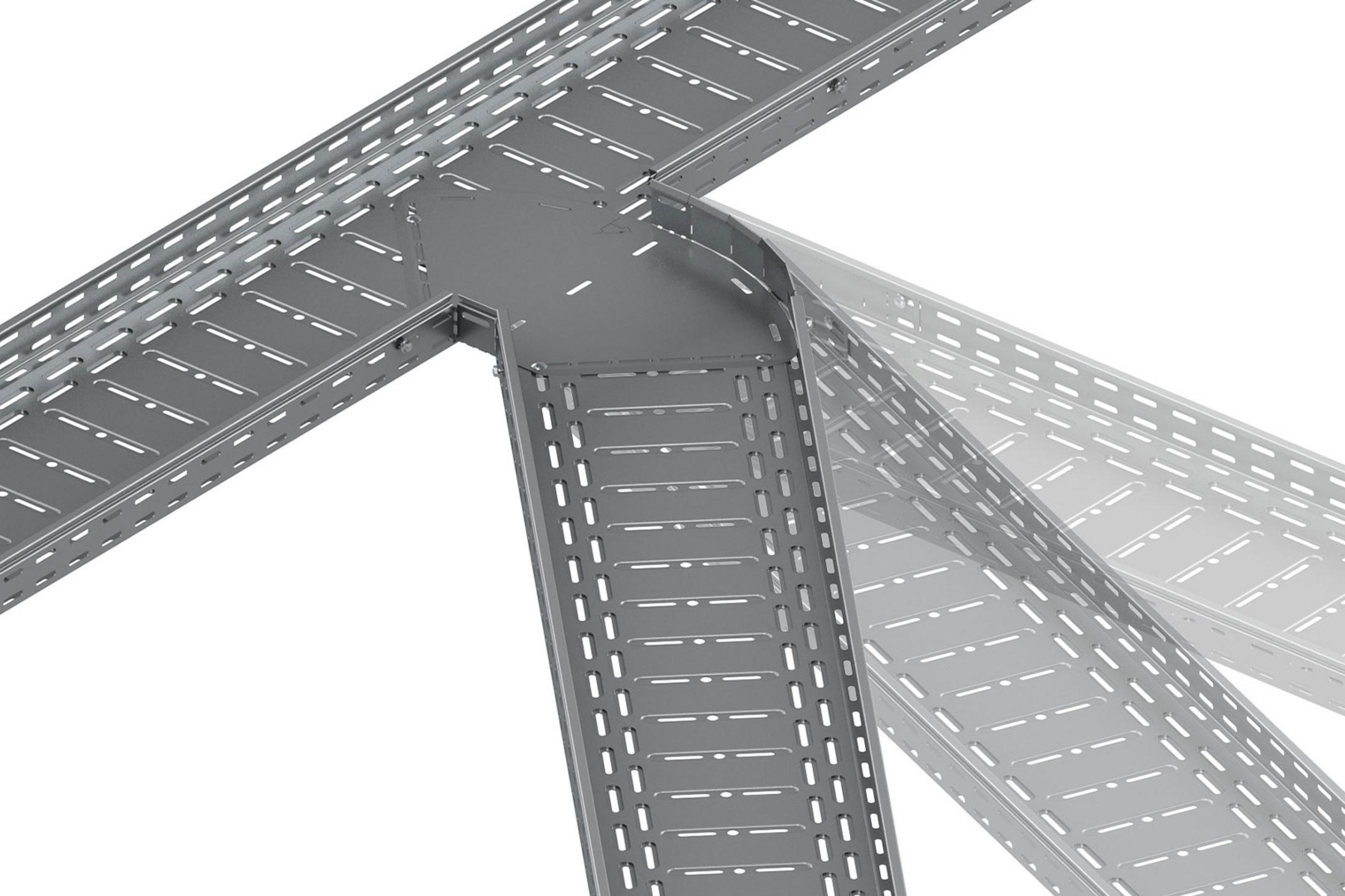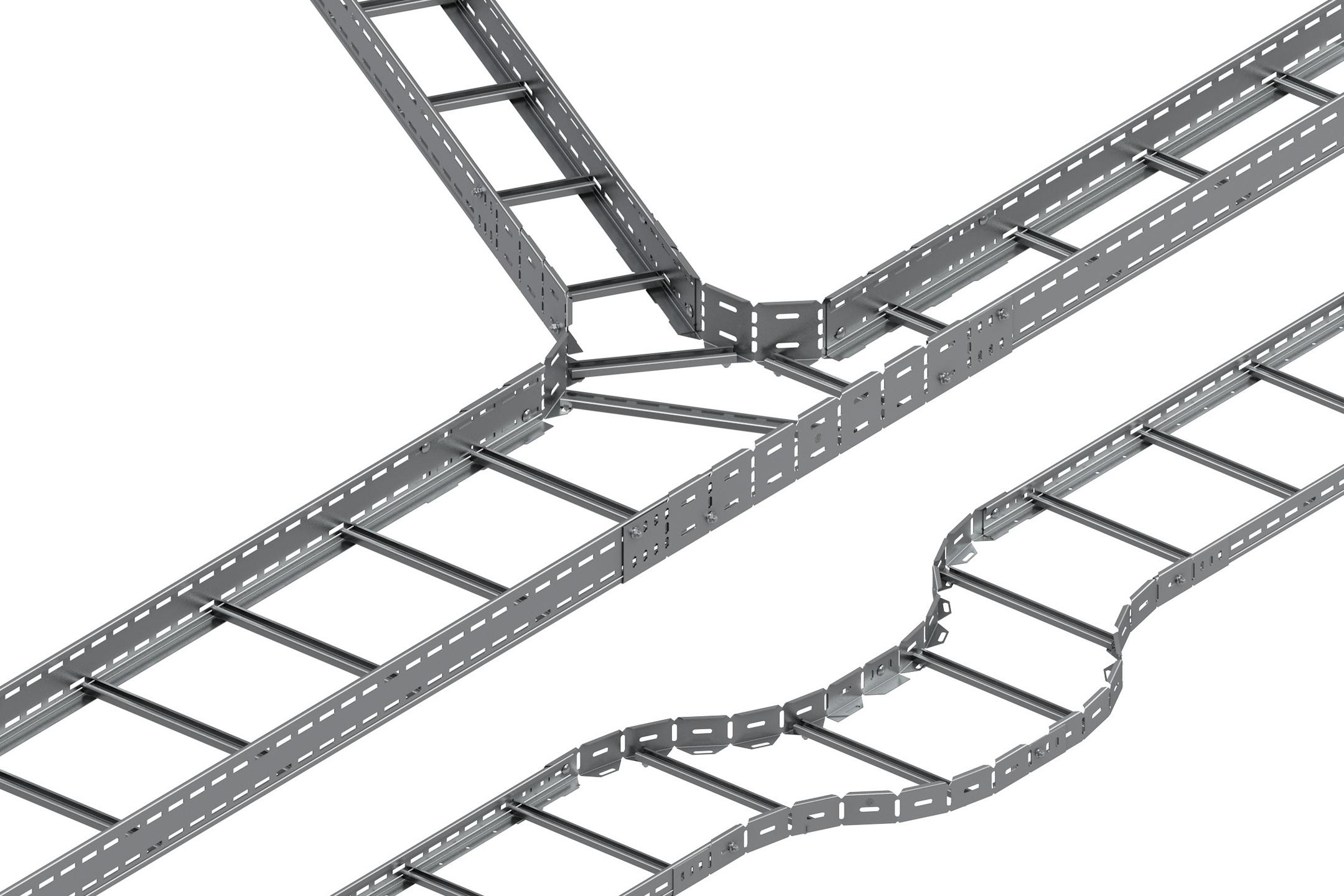 Das Portfolio der Form- und Zubehörteile unserer Kabeltragsysteme wurde neben dem neuen Rinnenbogen RBV noch um vier weitere Bauelemente ergänzt: die variable Kabelrinnen-Anbauecke RAEV, der variable Kabelleiter-Verbinder LGVHV sowie variable Trennstege wie der RTRV, LGTRV, WPTRV oder WTRV. Aufgrund ihrer Flexibilität lassen sich variabel horizontale Richtungsänderungen einfach realisieren und direkt auf der Baustelle z. B. spitze und stumpfe Winkel einfach und schnell ausgleichen.