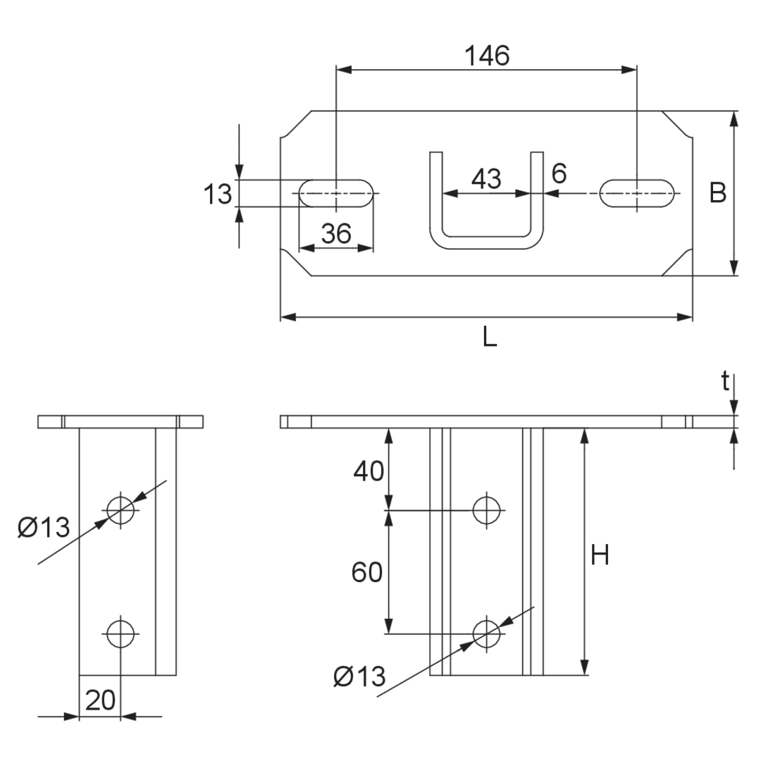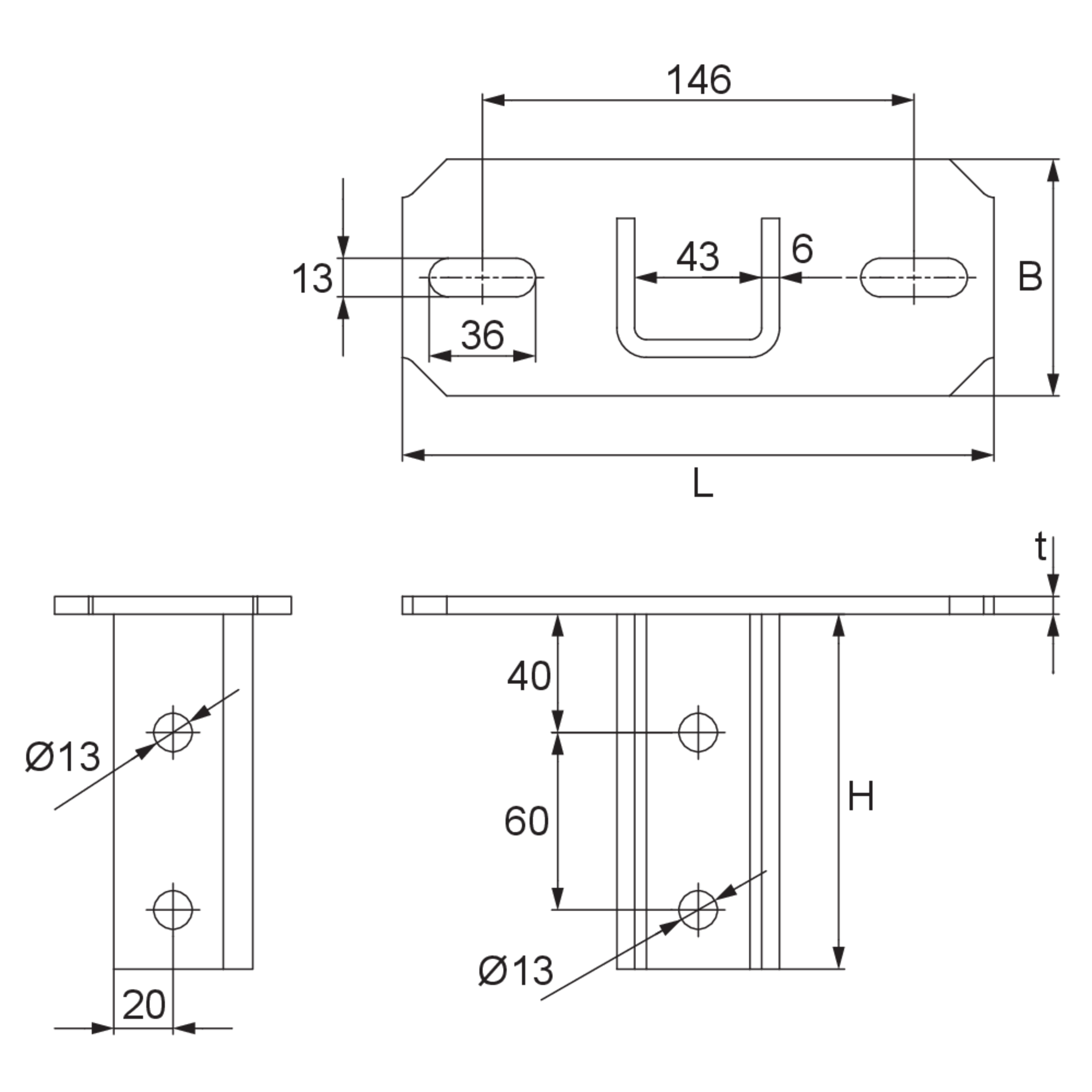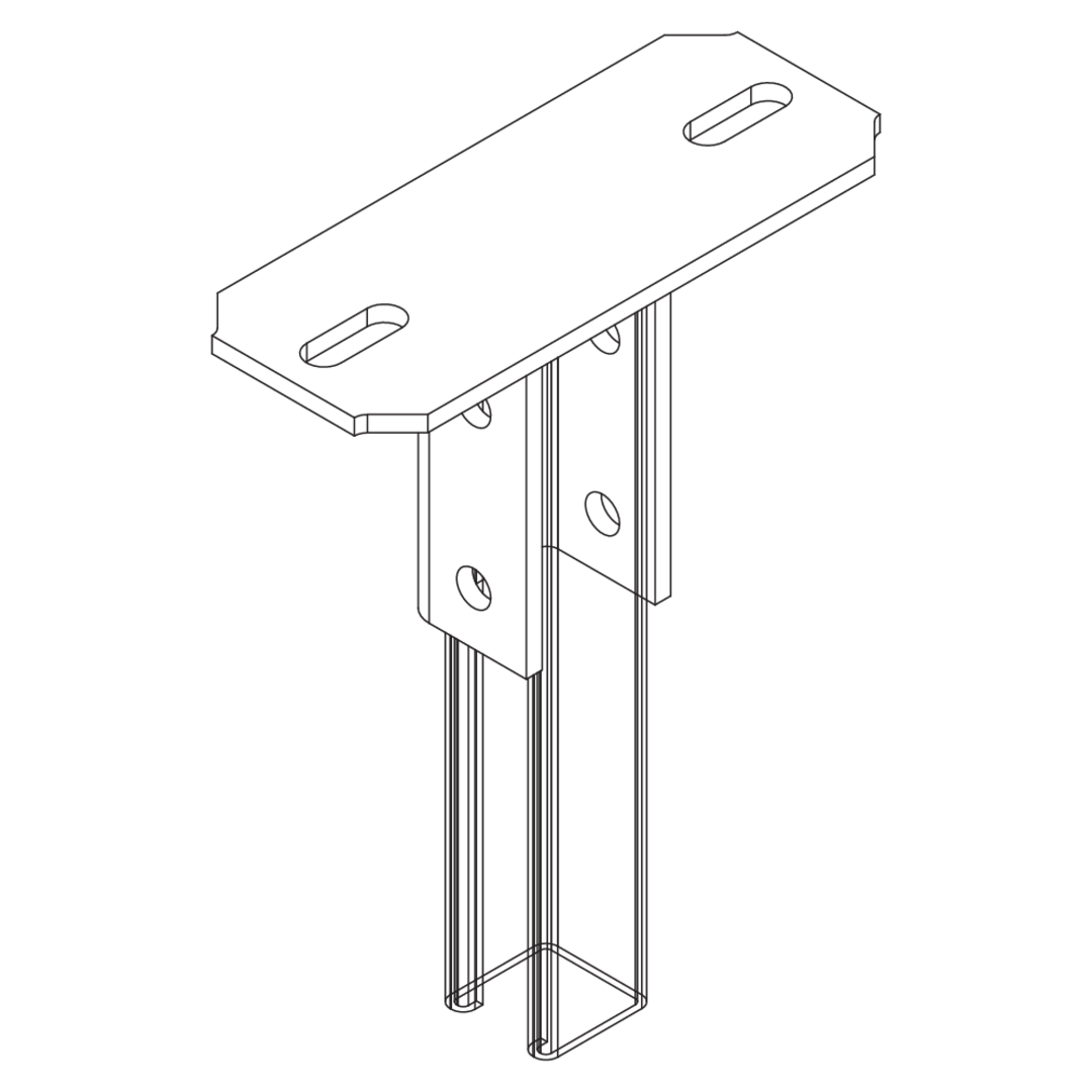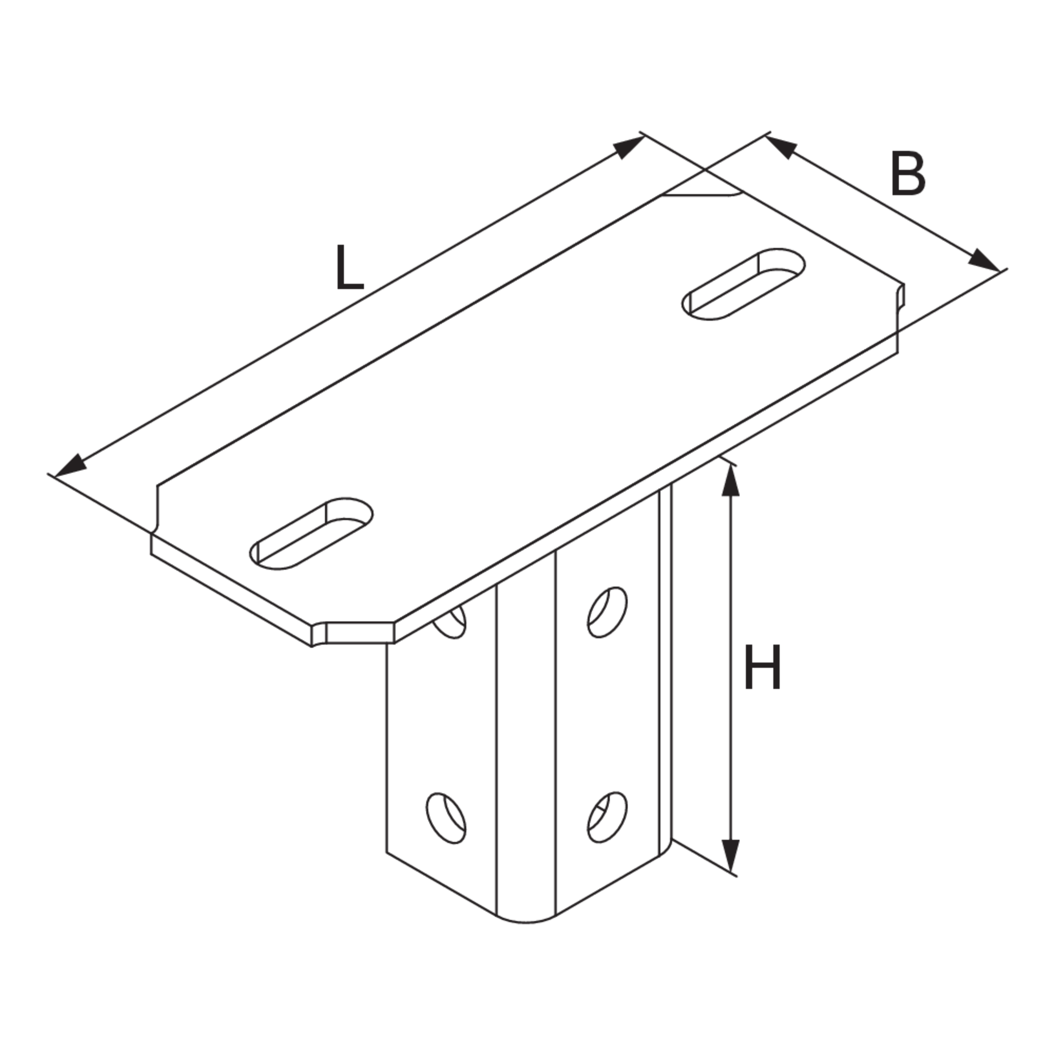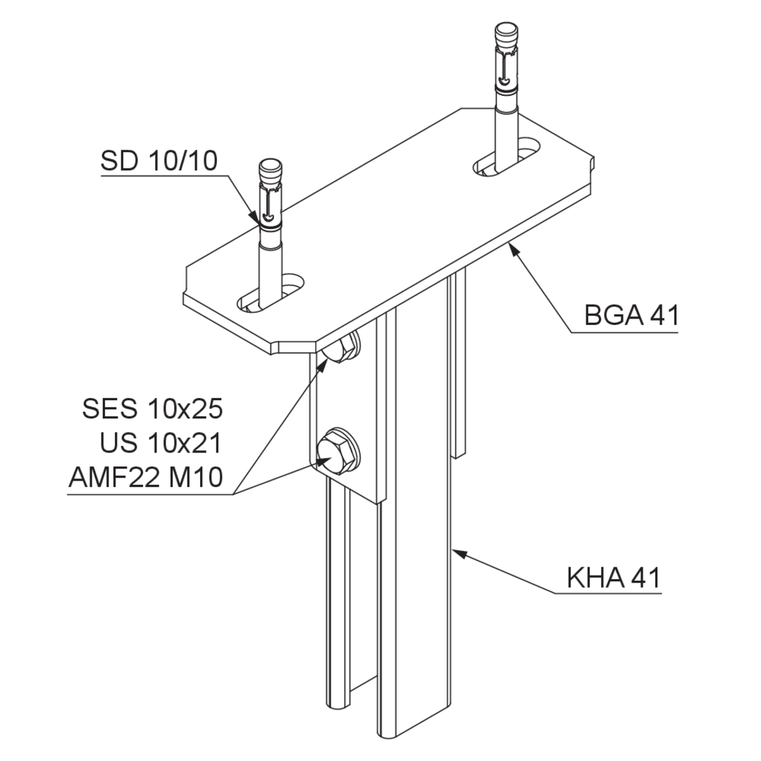 Die Kopfplatte BGA 41 dient der Deckenmontage des Konsolhalters KHA 41 oder KHAL 41. Sie wird an diesen angeschraubt und an die Decke gedübelt. Sie besteht aus tauchfeuerverzinktem Stahl.