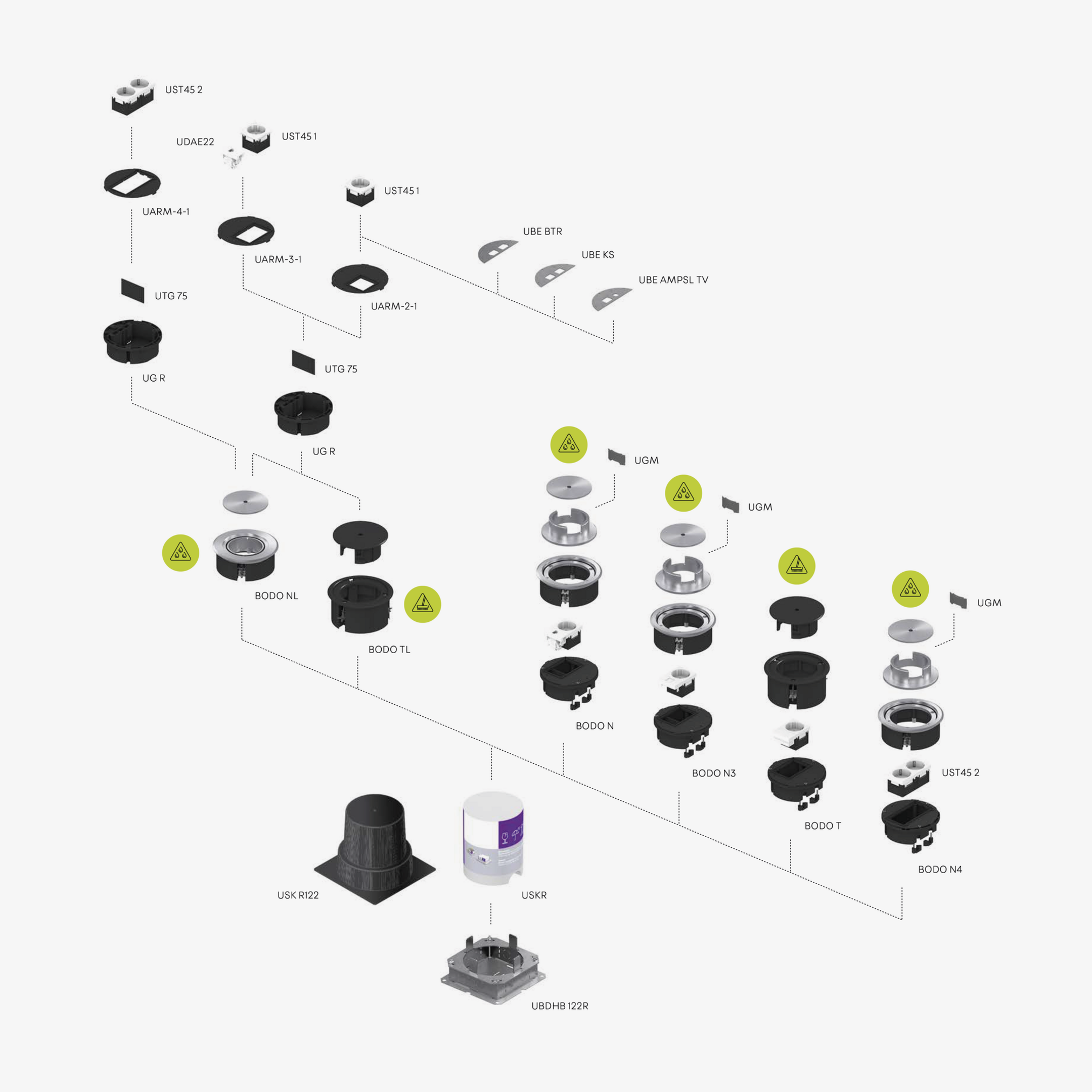 Bei den Bauelementen BODO N4 handelt es sich um runde Einzelauslässe mit Bodenbelagsschutz. Sie sind mit einem schwenkbaren Tubus als Kabelauslass, einem Deckel, einem Gerätebecher mit Zugentlastung und zwei Schutzkontaktsteckdose ausgestattet. Die Einzelauslässe eignen sich für trocken und nass gepflegte Räume mit hohen Verkehrslasten und können dort in Estrich und Doppel- oder Hohlraumbodenöffnungen eingebaut werden. Der Tubus mit Deckel und Tubusaufnahme wird aus Aluminium, Messing oder Edelstahl, Werkstoff Nr. 1.4301 (V2A), gefertigt. Der Rahmen und der Gerätebecher bestehen aus Kunststoff. Die Einzelauslässe sind, je nach Werkstoff, in unterschiedlichen Maßen erhältlich.