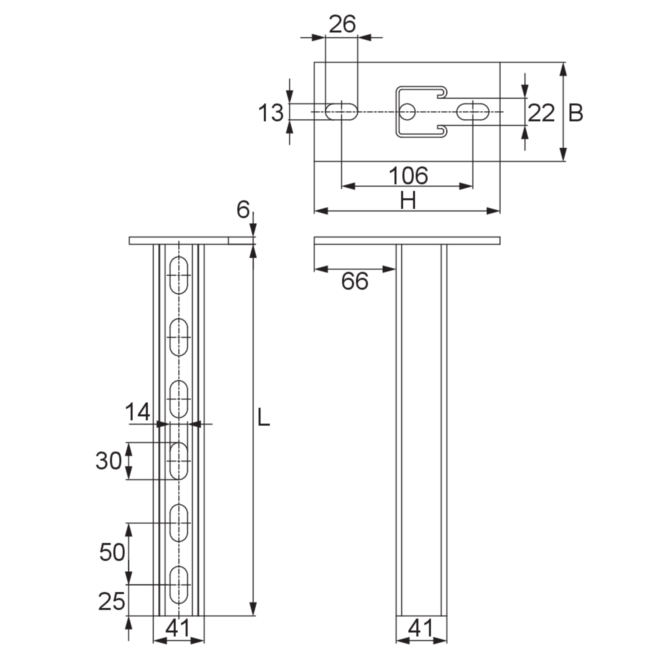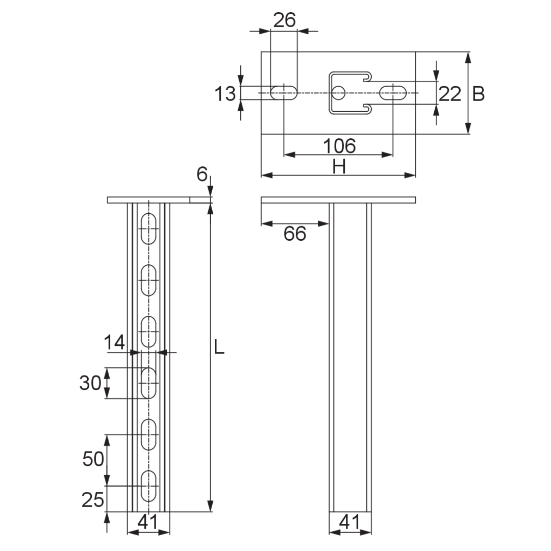 Der Konsolhalter KDAG 41 mit angeschweißter Kopfplatte besteht aus einem C+-Profil 41 x 41 mm mit fortlaufender Lochung und einer Schlitzweite von 22 mm. Er steht in tauchfeuerverzinktem Stahl zur Verfügung und ist in Längen bis 1000 mm lieferbar. (Materialstärke Profil = 2,5 mm; Kopfplatte = 6 mm) FD/P: Faktor zur Berechnung der Dübellast FD mit tatsächlicher Konsollast P bzw. Summe tatsächlicher Konsollasten.