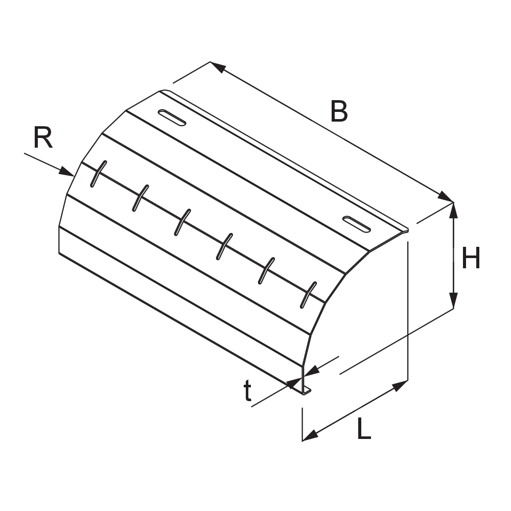 Das Kabelleiter-Abgangsblech LGKAB dient der kabelschonenden vertikalen Ausführung von Leitungen aus der Kabelleiter. Es hat eine der Kabelleiter entsprechende Breite von 140 bis 540 mm. Verschiedene Materialien und Oberflächen sorgen dafür, dass die Korrosionsanforderungen unterschiedlichster Anwendungsgebiete erfüllt werden.