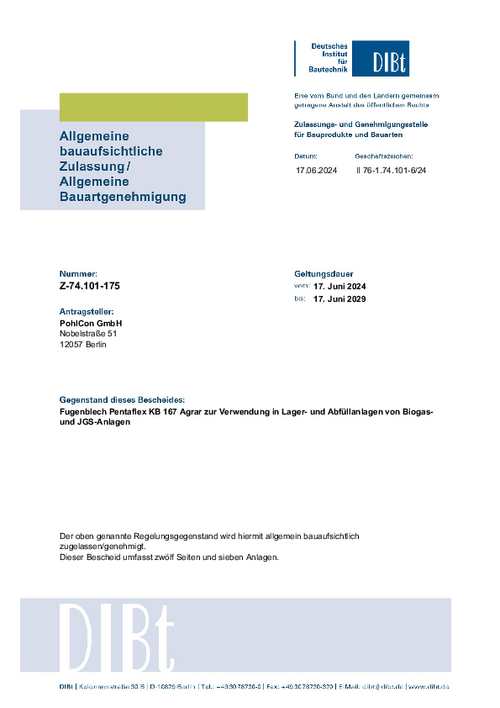 Die allgemeine bauaufsichtliche Zulassung Z-74.101-175 weist die Verwendbarkeit bzw. Anwendbarkeit von PENTAFLEX KB® 167 Agrar im Sinne der Landesbauordnungen nach. Gültig bis 17. Juni 2029.