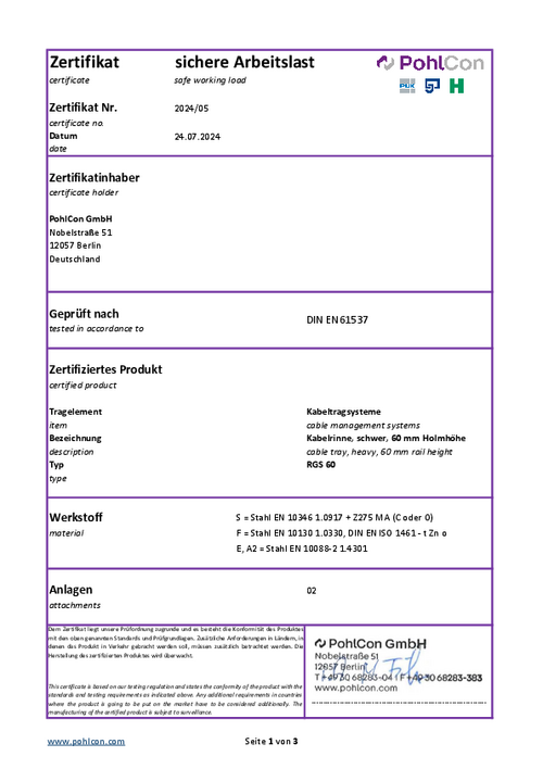 Zertifikat für Gitterbahn G 50-30, G 50-40; Kabelrinne RG 60-30, RGS 60-30, R 60-30; Kabelleiter LGG 60-30; Weitspannkabelrinnen WPR 120-30; Weitspannkabelleitern WLR 200-30, WPL 150-30