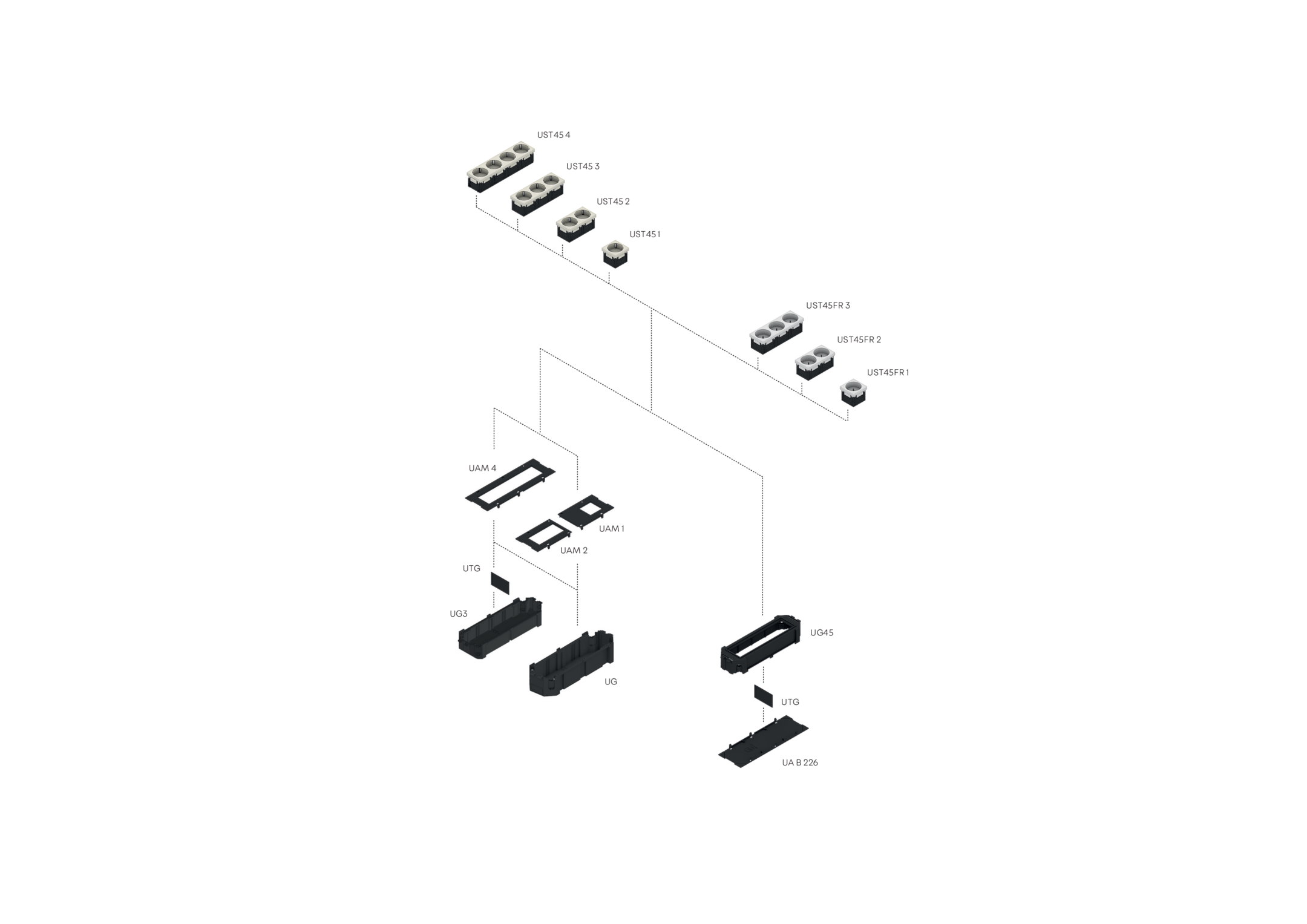 Bei den Bauelementen UAM 4 aus dem Sortiment der Unterflursysteme handelt es sich um rechteckige Abdeckplatten mit einer rechteckigen Aussparung. Die einteiligen Platten lassen sich als systemgebundenes Zubehör auf den Gerätebechern UG einrasten und dienen dort dem schraubenlosen Einbau eines vierfachen Installationsgerätes in der Ausführung 45x45mm. Die Einbauplatinen werden aus hochwertigem Acrylnitril-Butadien-Styrol-Copolymerisat (ABS) in der Farbe Graphitschwarz (RAL 9011) gefertigt. Sie besitzen eine mattierte Oberfläche und sind mit dem Einbaumaß E1 von 175 mm und E2 von 41 mm erhältlich.