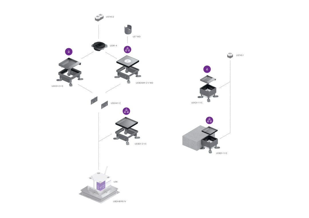 Bei den Bauelementen UEBD1-1 V E handelt es sich um viereckige Blinddeckel-Einzelauslasskassetten mit Stoßkante. Die Einbaueinheiten setzen sich aus einem nivellierbaren Kassetteneinbaurahmen mit Blindkassette, einem Aufnahmegehäuse und einer Gummidichtung zusammen. Sie werden direkt in Estrich- oder Hohlraumböden eingebaut und dort zur Aufnahme von Einbaugeräten verwendet. Die Einzelauslässe eignen sich für die Nutzung in nass gepflegten Räumen mit Büroverkehrslasten. Sie werden aus Edelstahl, Werkstoff Nr. 1.4301 (V2A), gefertigt und sind mit einem Einbaumaß von 115 x 115 mm, einem IP-Schutzgrad von IP 54 im ungenutzen Zustand und einem Nivellierbereich von 20 mm erhältlich.