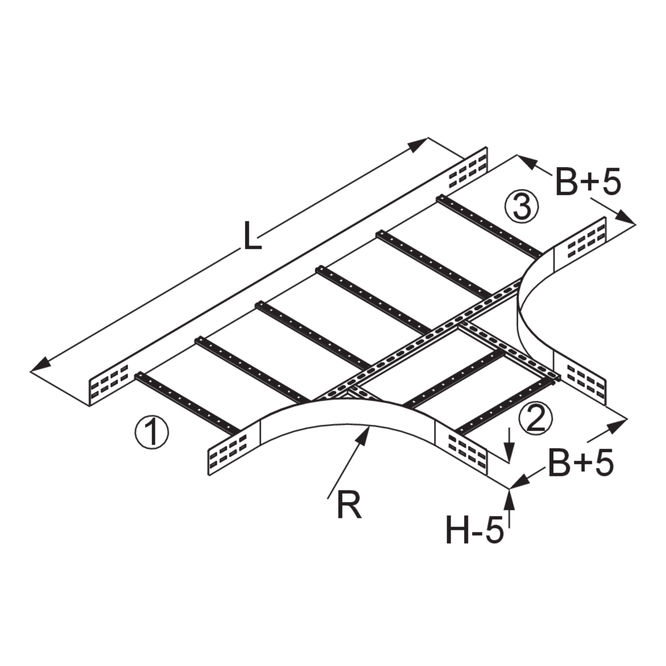 Weitspannkabelleiter-AbzweigHöhe120 mmBreite600 mmLänge2035 mmRadius450 mmGewicht je Lagermengeneinheit19.540 kgInklusivzubehör