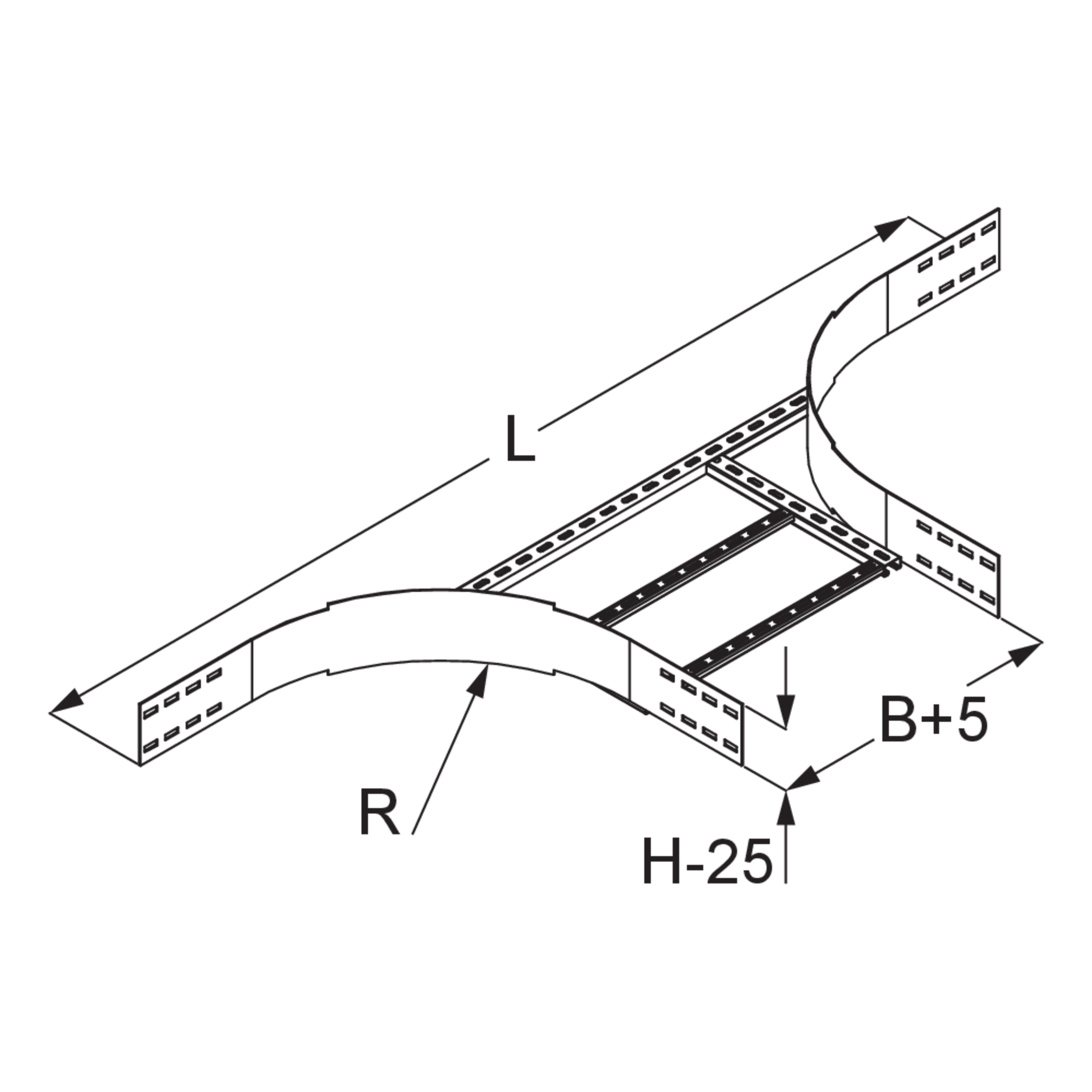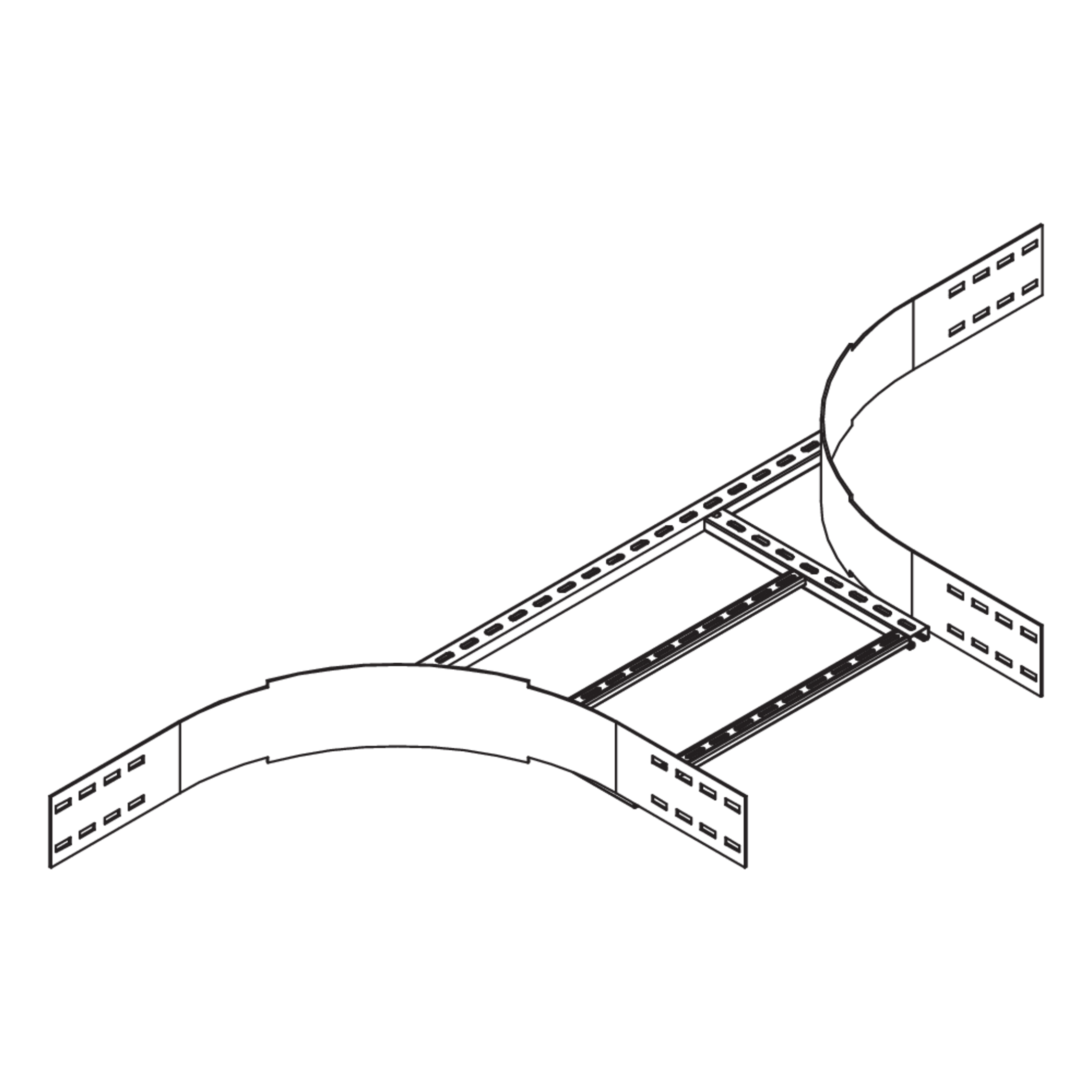 Weitspannkabelleiter-AnbauabzweigHöhe150 mmBreite500 mmLänge1935 mmRadius450 mmGewicht je Lagermengeneinheit12.050 kgInklusivzubehör - WPLAA 150-60F
