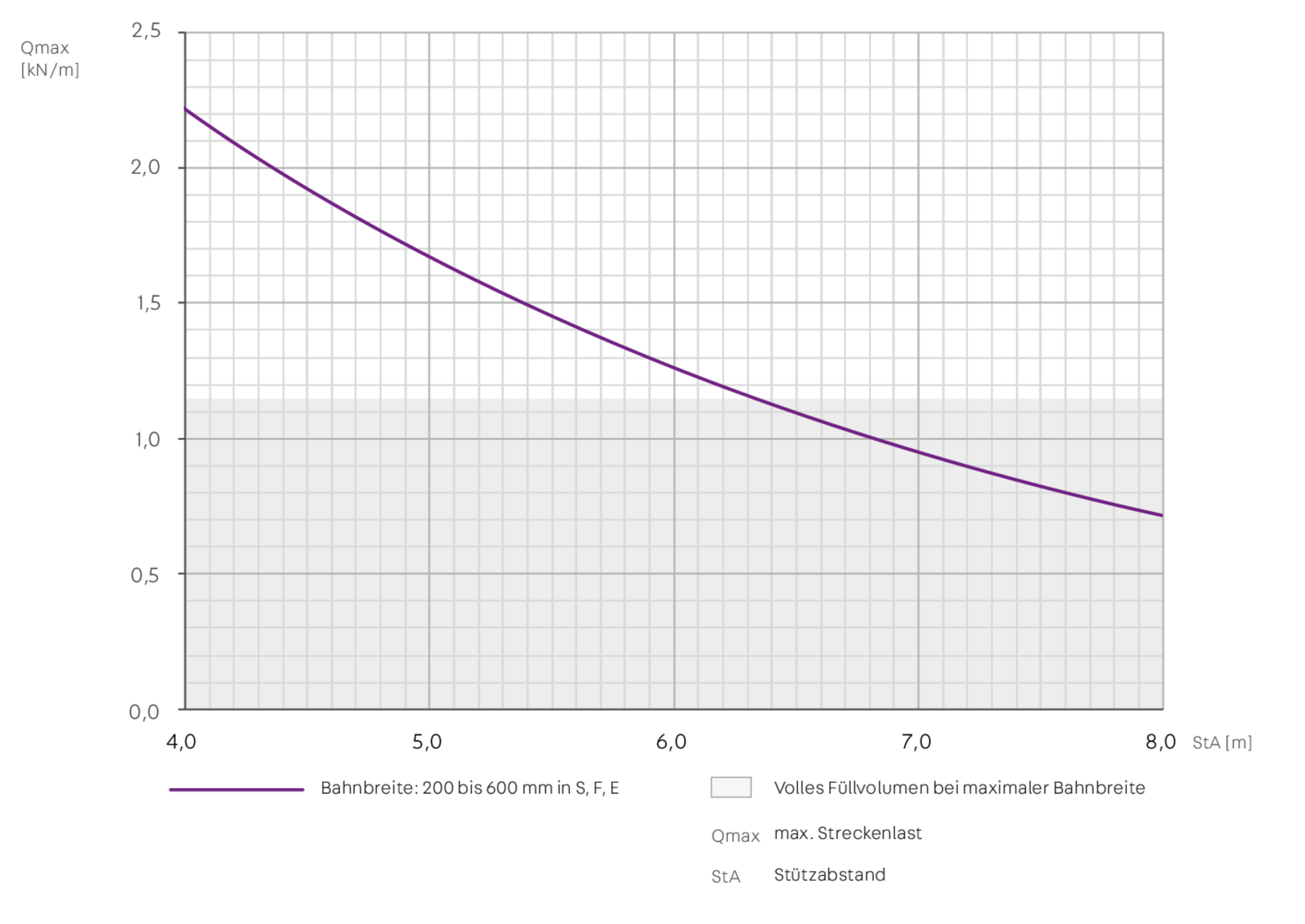 WeitspannkabelrinneHöhe150 mmBreite600 mmLänge6000 mmMaterialstärke1.8 mmStreckenlast Steuerkabel1.15 kN/mQuerschnittsfläche768 cm2Gewicht je Lagermengeneinheit78.000 kg
