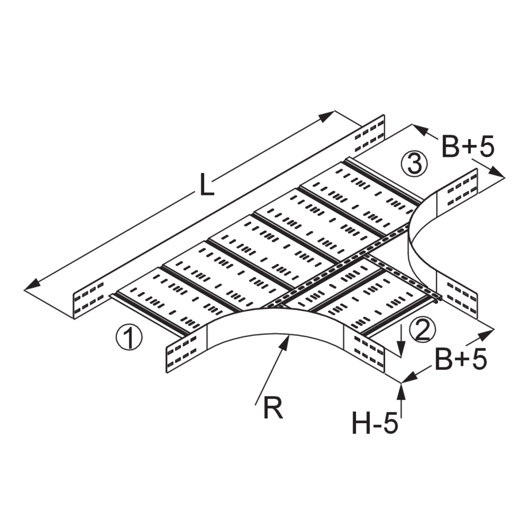 Der T-förmige Weitspannkabelrinnen-Abzweig WPRA 150 mit integrierten Seitenverbindern ermöglicht Richtungsänderungen der Kabelführung in Form eines Abzweigs. Er eignet sich für Weitspannkabelrinnen mit einer Holmhöhe von 150 mm und weist Breiten von 200 bis 600 mm auf. Er wird zwischen zwei Weitspannkabelrinnen eingesetzt. Anschließend lässt sich die Anschlussrinne mit einem Bodenverbinder VB einschieben. Verschiedene Materialien und Oberflächen sorgen dafür, dass die Korrosionsschutzerfordernisse unterschiedlichster Anwendungsgebiete erfüllt werden. Sonderkonstruktionen mit unterschiedlichen Anschlussbreiten ①, ②, ③ oder abweichenden Radien R können angefragt werden.