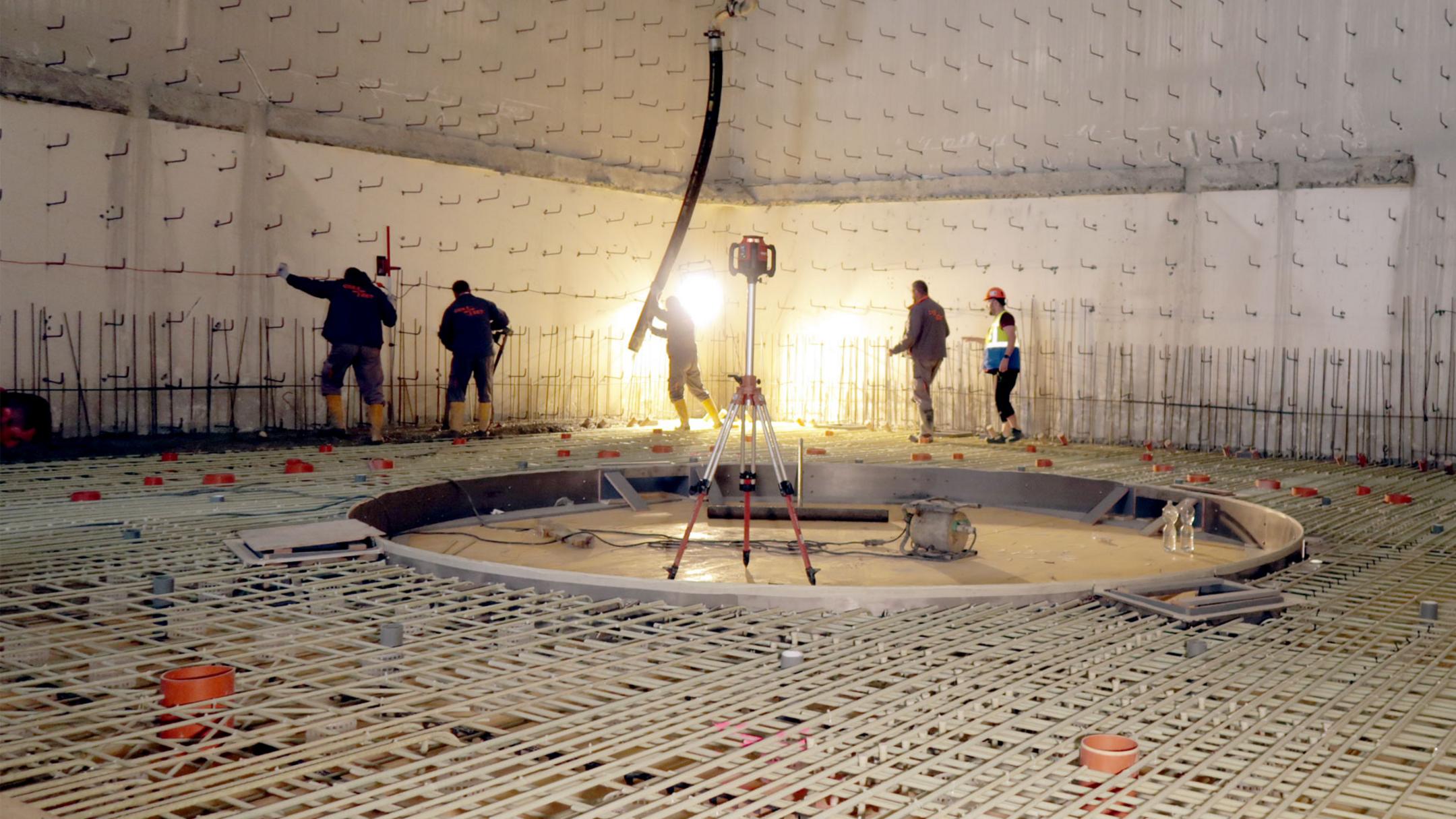 Ursprünglich sahen die Entwürfe den Einsatz von nichtmagnetischem Edelstahl für die Betonbewehrungen vor. Durch den Krieg gegen die Ukraine kam es allerdings zu schwerwiegenden Lieferengpässen. Deshalb kam hier die Glasfaserkunststoffbewehrung (GFK) FIBERNOX V-ROD der PohlCon-Marke H-BAU Technik ins Spiel: Sie ist durchlässig für Magnetfelder und Funkfrequenzen und entspricht damit allen Vorgaben. In der Bodenplatte und in den Stützen wurden insgesamt 6.000 m FIBERNOX V-ROD Bewehrungsstäbe (gerade und gebogen) in den Durchmessern 12 bis 25 mm verbaut. Über 430 Doppelkopfbolzenstäbe mit je 190 mm Länge und 12 mm Durchmesser kommen als Durchstanzbewehrung zum Einsatz sowie 80 nichtmetallische Abstandhalter in je 2 m Lieferlänge.