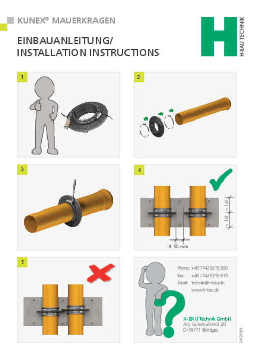 Die KUNEX® Mauerkragen werden zur Abdichtung von flachen und runden Erdungsbändern sowie von Rohrleitungen verwendet, die Bauteile aus wasserundurchlässigem Beton durchdringen. Der Mauerkragen besteht aus thermoplastischem Elastomer (TPE) und ist geprüft und beständig gegen eine Vielzahl von chemischen Stoffen. Die einfache Montage und Verwendbarkeit mit allen gängigen Rohrmaterialien und Durchmessern macht das System zu einer flexiblen, sicheren und wirtschaftlichen Lösung, die bauseits lediglich einer glatten, sauberen und schadfreien Oberfläche der verwendeten Grundleitung oder des Erdungsbands bedarf. Die Lieferung erfolgt montagefertig mit allen erforderlichen Materialien.