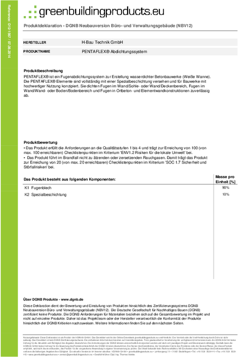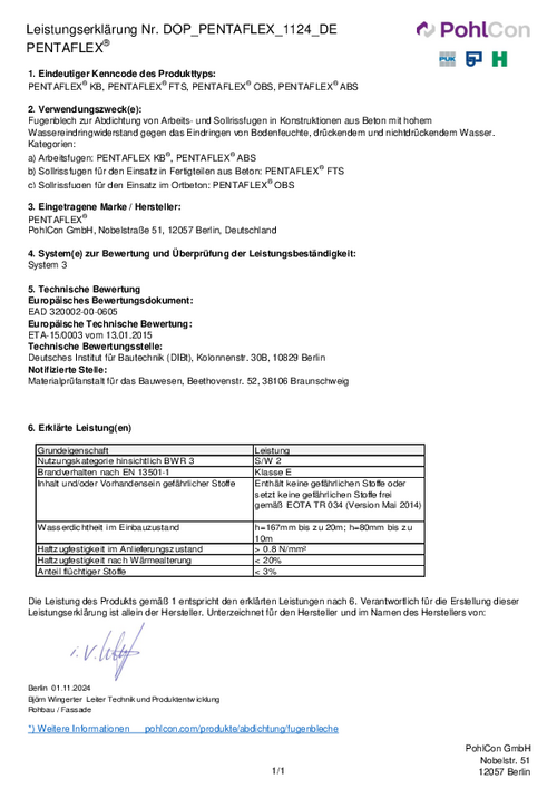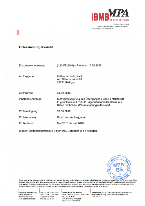 Dieser Prüfbericht beinhaltet die Dichtigkeitsprüfung des Überganges (Fugenbandanschluss) einer PENTAFLEX® KB Fugenblechs auf PVC-P Fugenbänder in Bauteilen aus Beton mit hohem Wassereindringwiderstand.