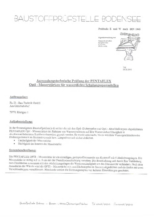 Prüfbericht PENTAFLEX® Opti Mauerstärken