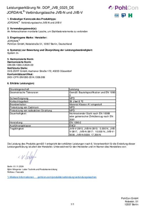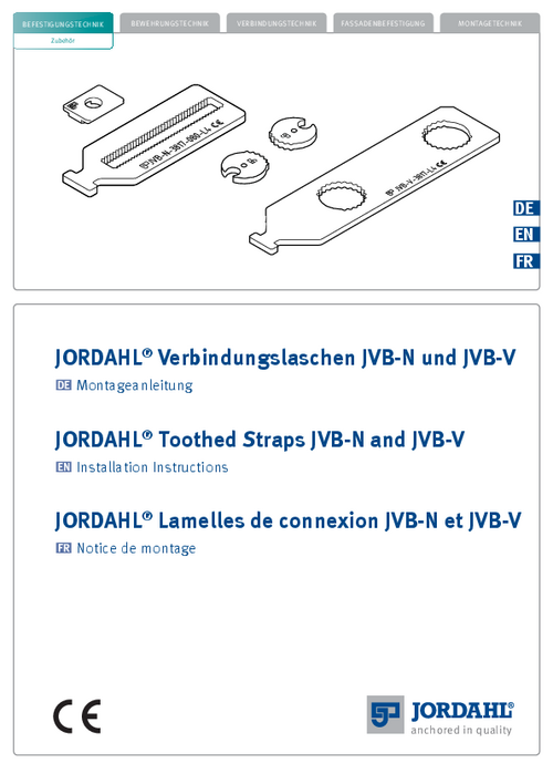 Die Verbindungslaschen JVB stellen zusammen mit den Ankerschienen JTA Verbindungen zwischen Betonfertigteilen her. Im Produktportfolio finden sich die Verbindungslaschen JVB-V für einen stirnseitigen Stützenwandanschluss zur Übertragung von Querbelastungen sowie JVB-N für einen seitlichen Stützenwandanschluss zur Übertragung von Zugbelastungen. Die Verbindungslaschen JVB-Z und -ZS eignen sich ebenfalls für die Übertragung von Zugbelastungen. Die JVB-ZS mit der angeschweißten Schraube kann zudem Zug- und Druckkräfte aufnehmen. Weiterhin gibt es die Kippsicherungen, die besonders bei kleinen Zug- und Drucklasten genutzt werden.