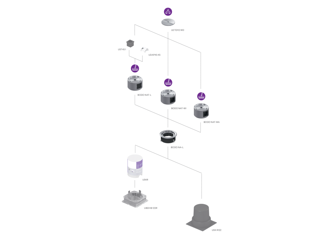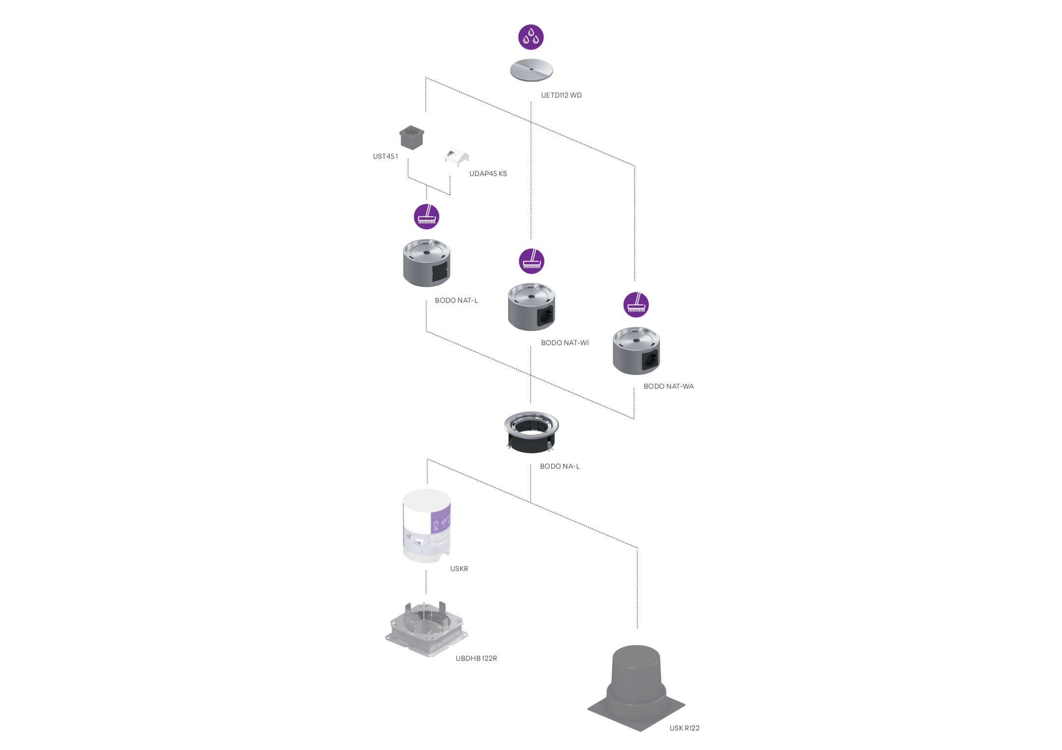 BODO NAT-W components are round on-floor tube outlets that can be closed using a bayonet catch and are equipped with a black Schuko socket and a black snap-in connector. The outlets can only be used in conjunction with a dummy cable outlet and can be supplemented with an additional 45x45 mm installation device or a tube outlet pre-assembled by Wieland or WAGO. They can be installed in screed and raised or false floor openings in wet-cleaned or dry-cleaned rooms with high traffic loads. The tube outlets are made of aluminium with a black finish and have an IP protection rating of IP 66 in an unused condition and IP 20 when used.