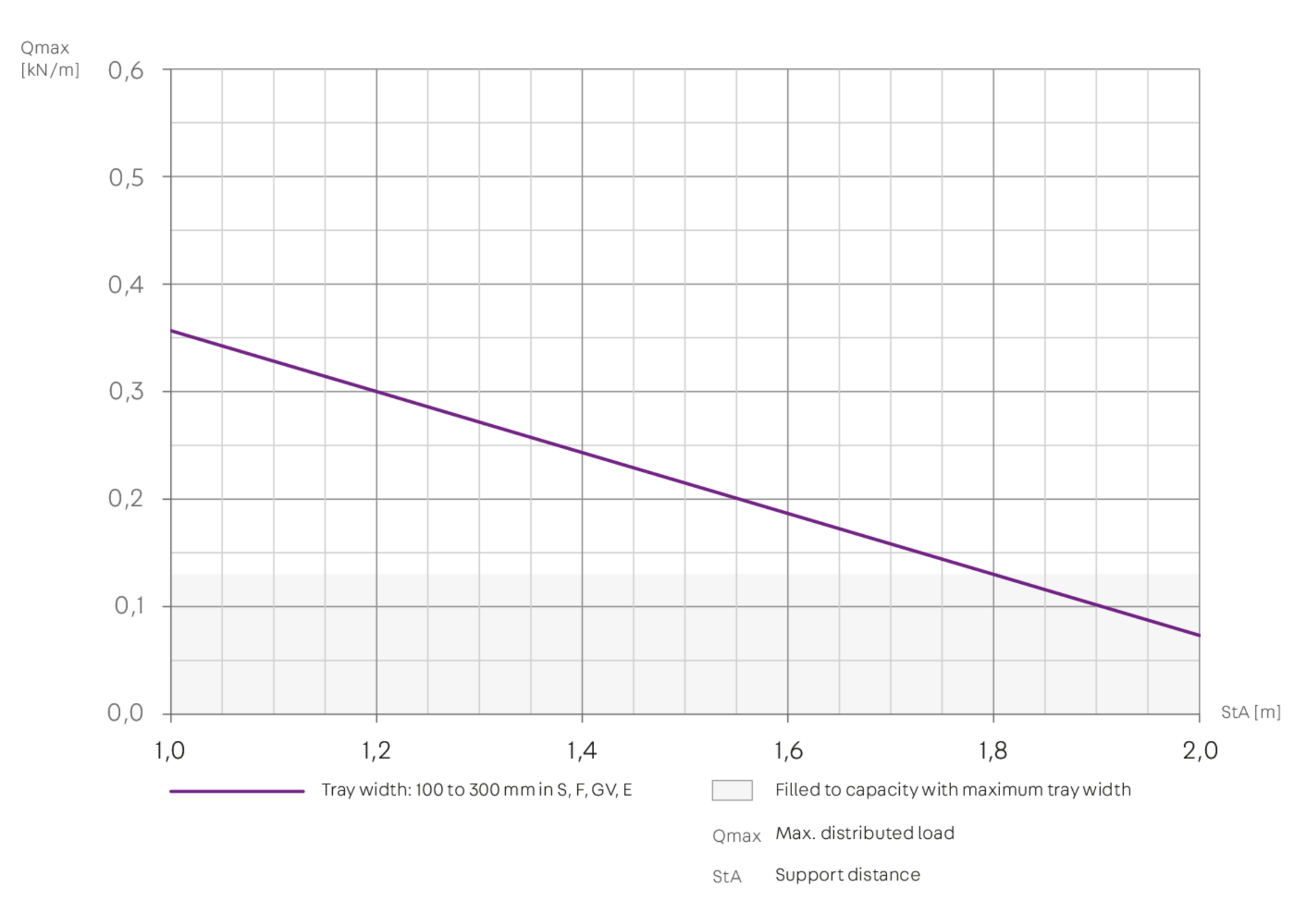 wire mesh trayheight38 mmwidth316 mmlength3004 mmdistributed load control cable0.13 kN/mwire diameter4.00 mmcross section area87 cm2Weight per storage unit3.740 kg