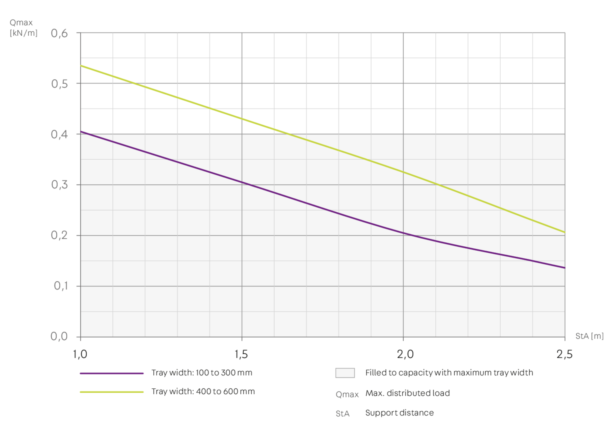 Wire-mesh cable tray G 50-60Sheight54 mmwidth618 mmlength3004 mmmaterial thickness4.50 mmdistributed load control cable0.4 kN/mcross section area264 cm2Weight per storage unit8.680 kg