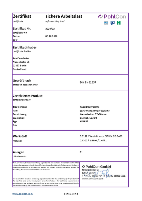 The bracket holder KDU 57 with welded-on top plate (material thickness t) is easy to use as a construction profile due to its continuous, three-sided perforation. It consists of a U profile 57 x 30 mm. A support piece must be used if the bracket is 400 mm long or if the bracket is being mounted in the end zone of the ceiling strut. If no support piece is used, the permissible loads must be reduced by 30%. We provide components in various materials and surface finishes to ensure that the corrosion requirements are met for all sorts of applications. FD/P: Factor for calculating the dowel load FD with actual console load P. The permissible loads are achieved using a support piece.