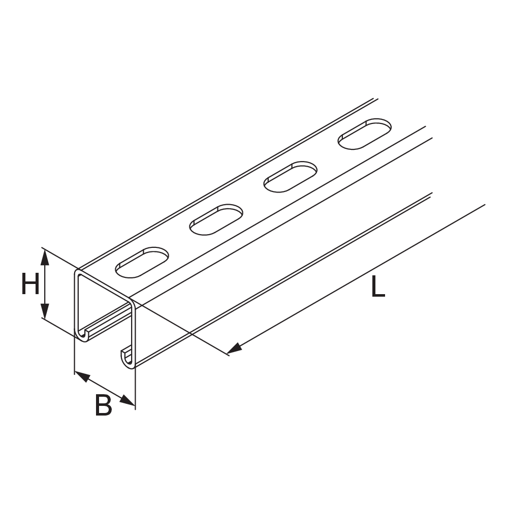 The mounting channel KHA 41 consists of a C+ profile 41 x 41 mm with continuous perforation and a slot width of 22 mm made from material 2.5 mm thick. It is made of hot-dip galvanised steel. KHA 41 also serves as a bracket holder in combination with head plate BGA 41 and is available in lengths of up to 6000 mm.