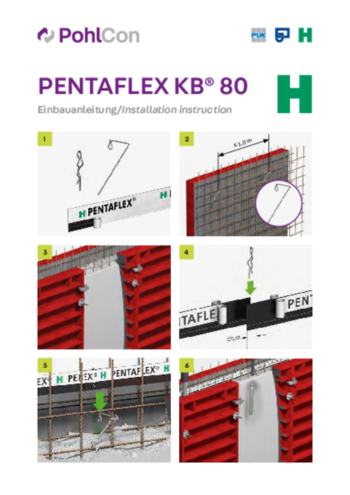 PENTAFLEX KB® 80 is a galvanised steel sheet with a special coating for sealing construction joints in walls/slab areas. It is attached to the wall reinforcement using one mounting stirrup per metre. The guide marking can be used to easily check the minimum embedment depth of 30 mm during casting. The individual elements are 2 m long and 80 mm high. They are covered on both sides by a split protective film that is only removed immediately before pouring the concrete. Construction joints sealed with PENTAFLEX KB® 80 withstand a water pressure of up to 5.0 bar.