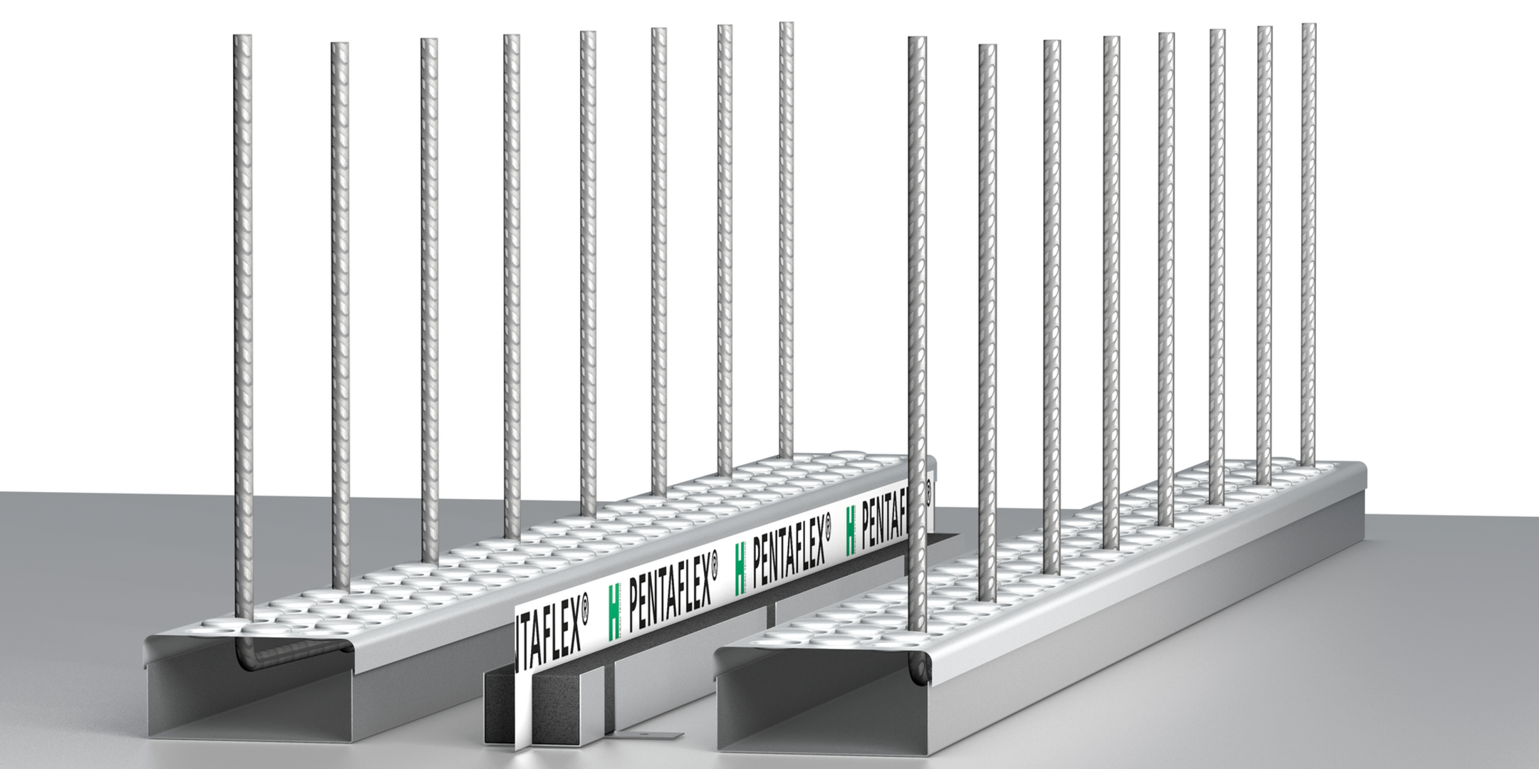 The PENTAFLEX® Module in combination with FERBOX® rebend connections is used wherever building components have to be joined together with a frictional and waterproof connection, especially in parts of buildings below ground level such as underground garages and basements. The PENTAFLEX® Module consists of the 60 mm high PENTAFLEX KB® joint sheet, a reinforcement box as an installation aid and foam filler strips for recesses. The module is available in lengths of 800 or 1200 mm. Other lengths are available on request.