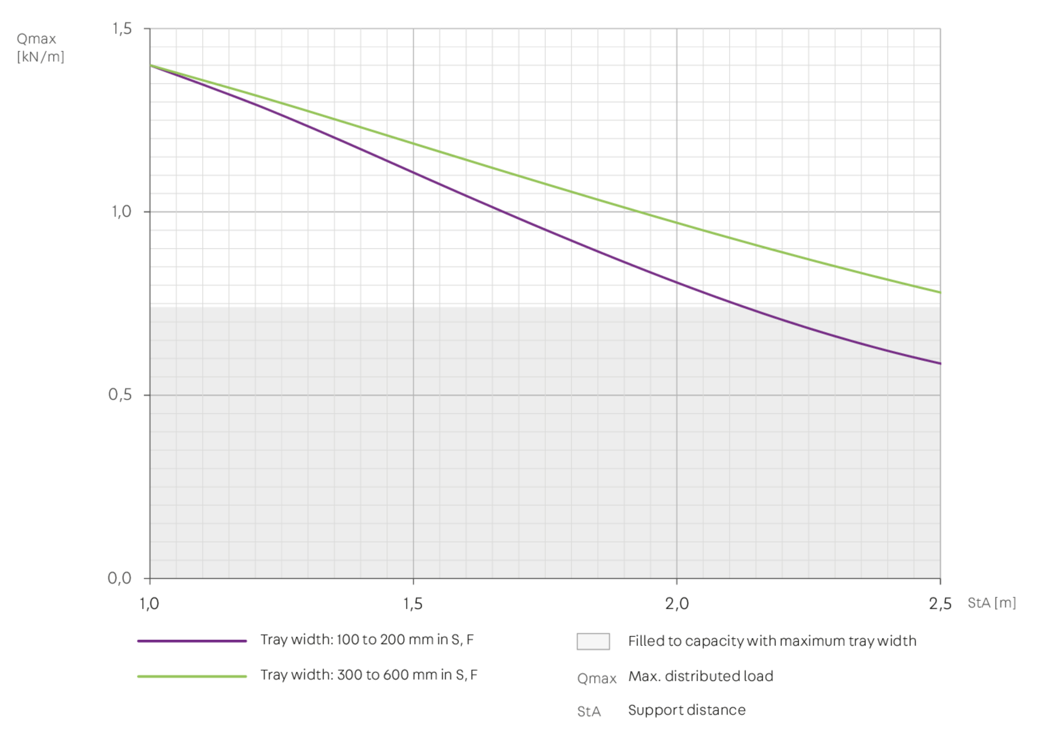 Cable tray, unperforated R 85-40Sheight85 mmwidth400 mmlength3000 mmmaterial thickness0.88 mmdistributed load control cable0.51 kN/mcross section area337 cm2Weight per storage unit12.616 kg - R 85-50S