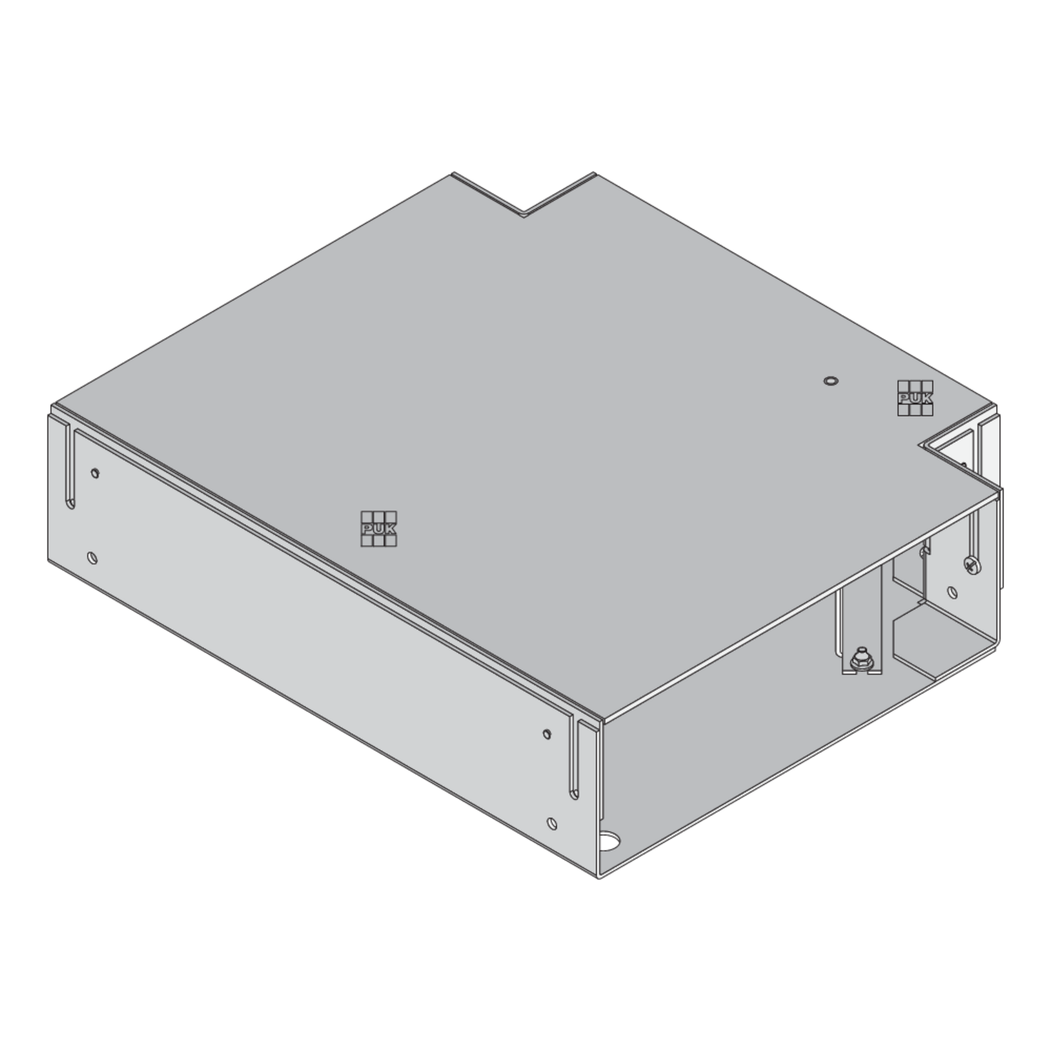 The UBEBMAL 85 T-junction is a component within the CHALI screed-flush brush ducts system. This product serves as a connector between two duct sections. Thanks to its T-shape, cables can be laid within a trunk section in the desired direction. The component is made of sendzimir hot-dip galvanised sheet steel in accordance with DIN EN 10346.