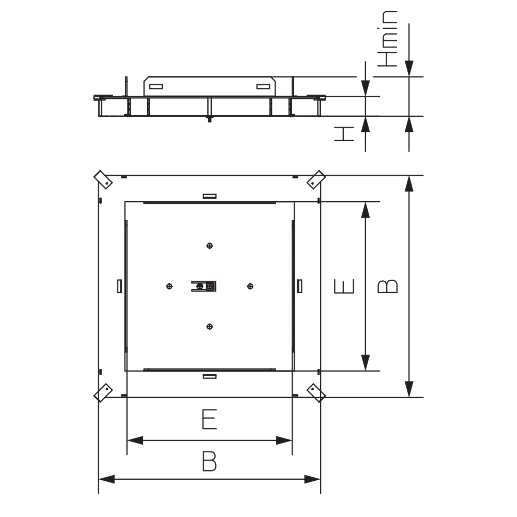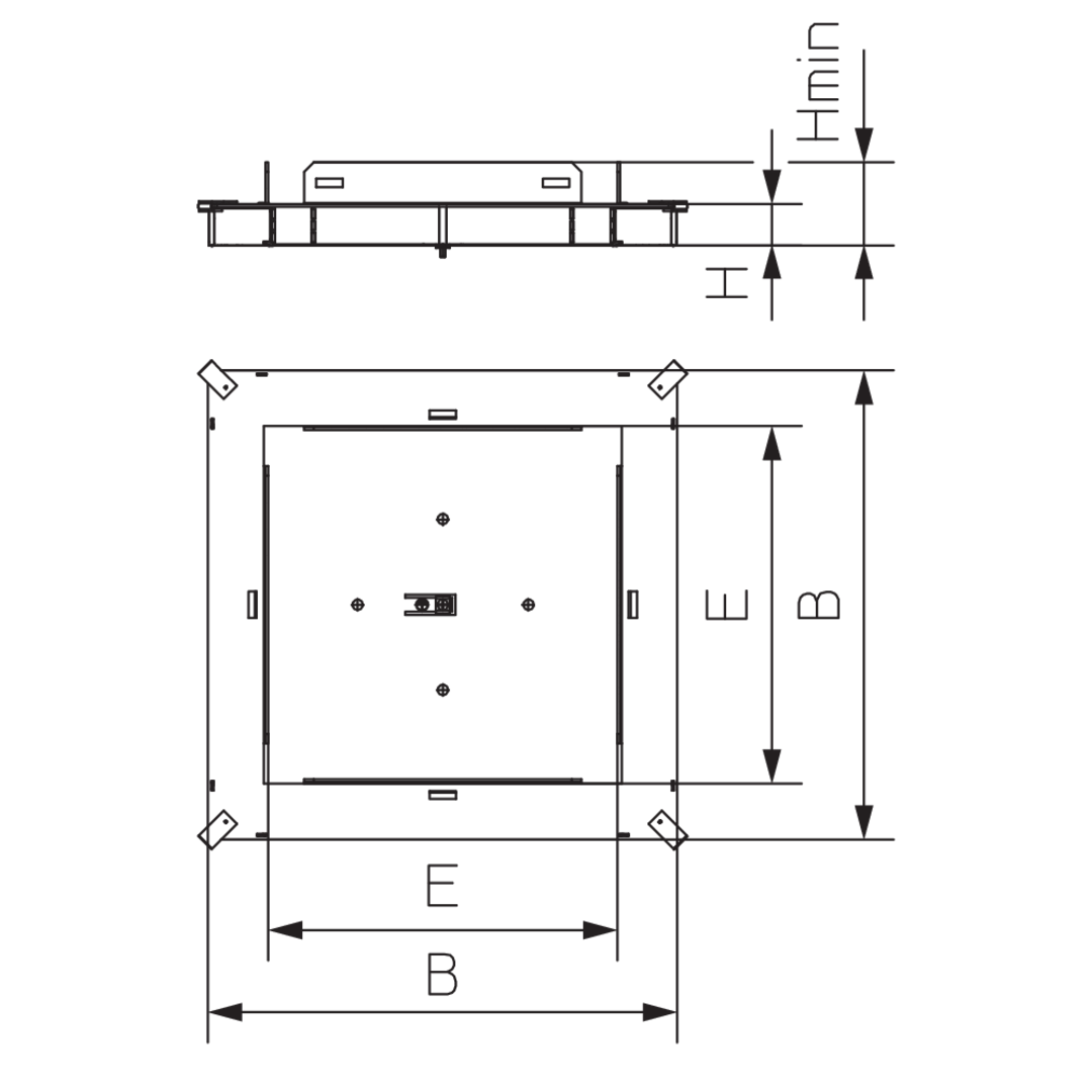 Suitable for 190 mm and 250 mm duct widths, it features foldable side walls for flexible duct connections. The two-piece design includes a removable and snap-on cover. The square opening (262×262 mm) holds the shuttering unit USK, later replaced by a triple device unit. A built-in protective earth terminal ensures safe equipotential bonding.