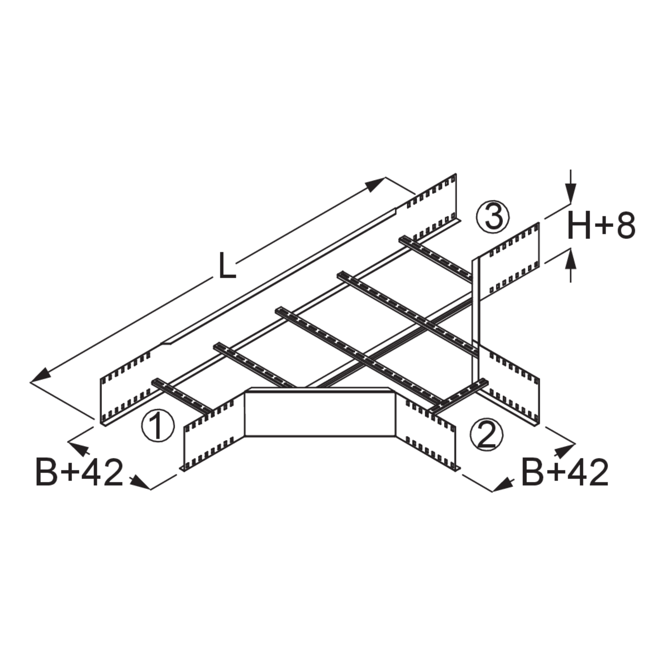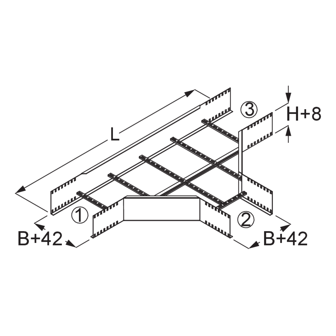 The T-shaped wide-span cable ladder branch WLA 200 with integrated connectors allows the direction of the cable routing to be changed in the form of a branch. It is suitable for WL 200 wide-span cable ladders and from 200 to 600 mm wide. The wide-span cable ladder branch is inserted between two WL 200 wide-span cable ladders. The connecting rack can then be pushed in. It is made of hot-dip galvanised steel.