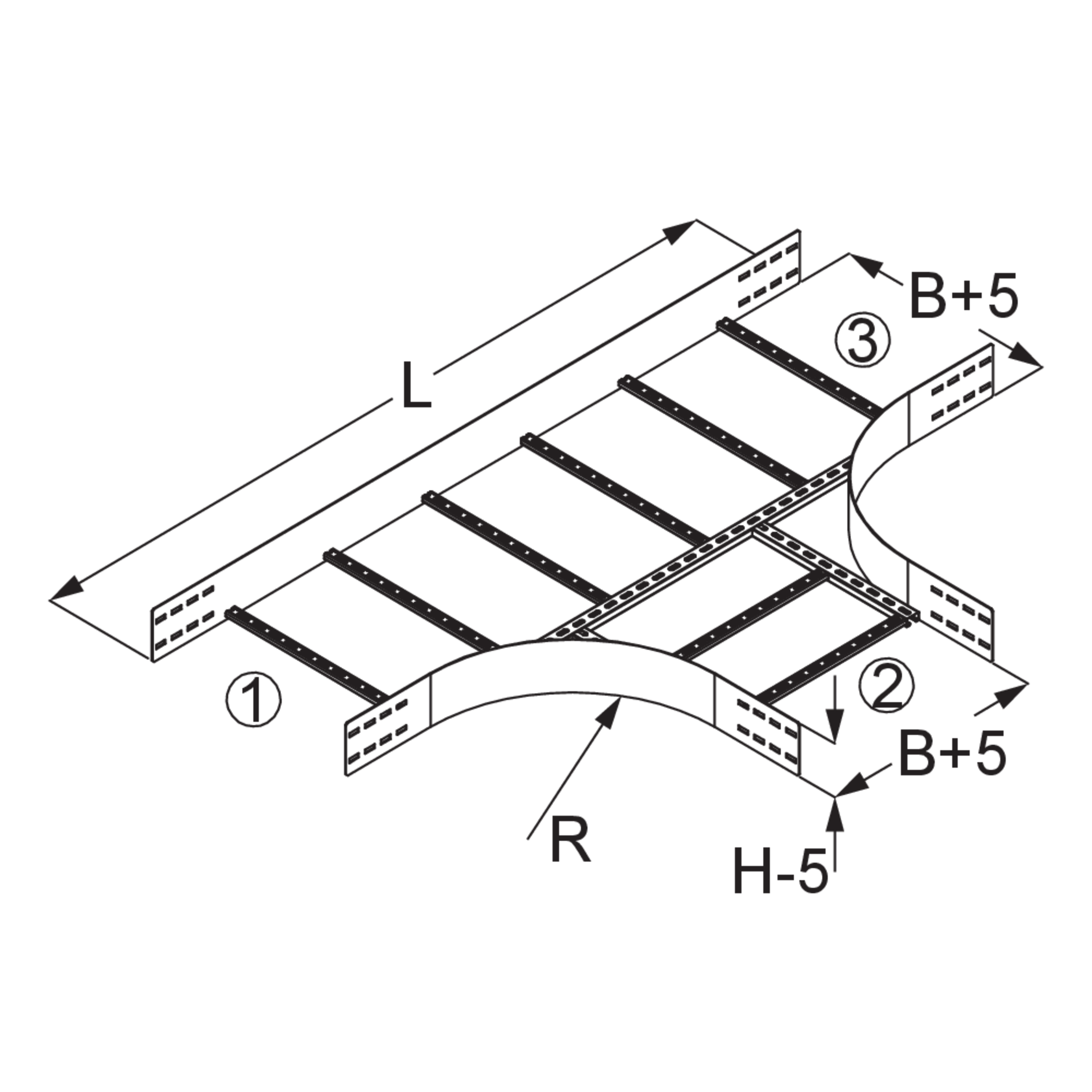 The T-shaped wide-span cable ladder branch WPLA 150 with integrated connectors allows the direction of the cable routing to be changed in the form of a branch. It is suitable for wide-span cable ladders with rails 150 mm high and is 200 to 600 mm wide. The branch is inserted between two wide-span cable ladders. The connecting rack can then be pushed in. We provide components in various materials and surface finishes to ensure that various corrosion protection requirements for different areas of application are met. Special designs with different connection widths ①, ②, ③ or different radii R can be requested.