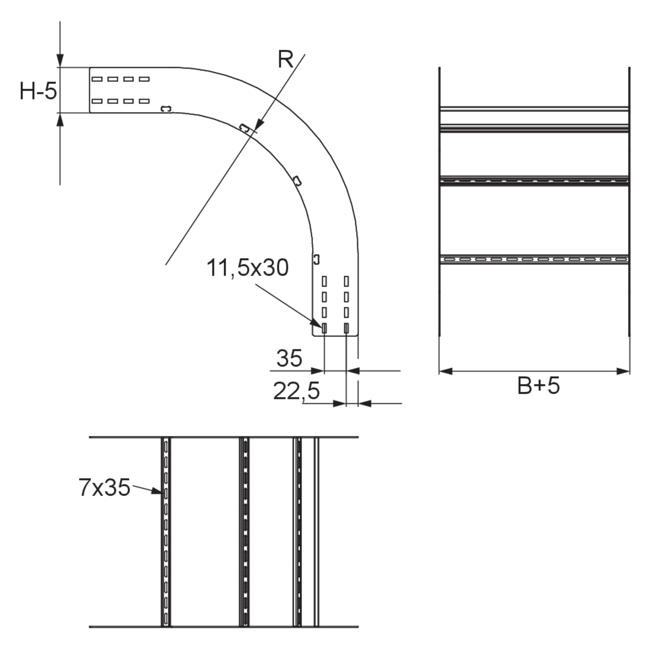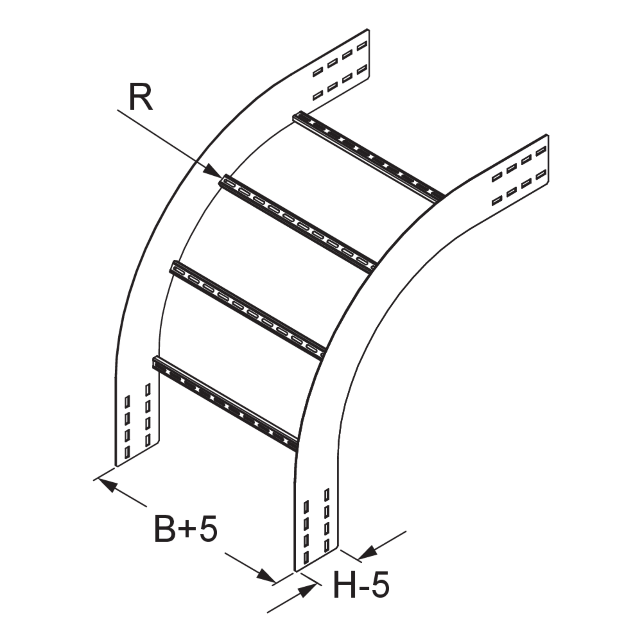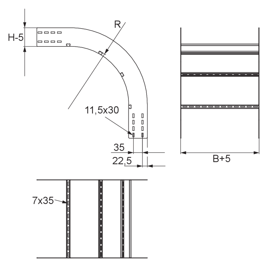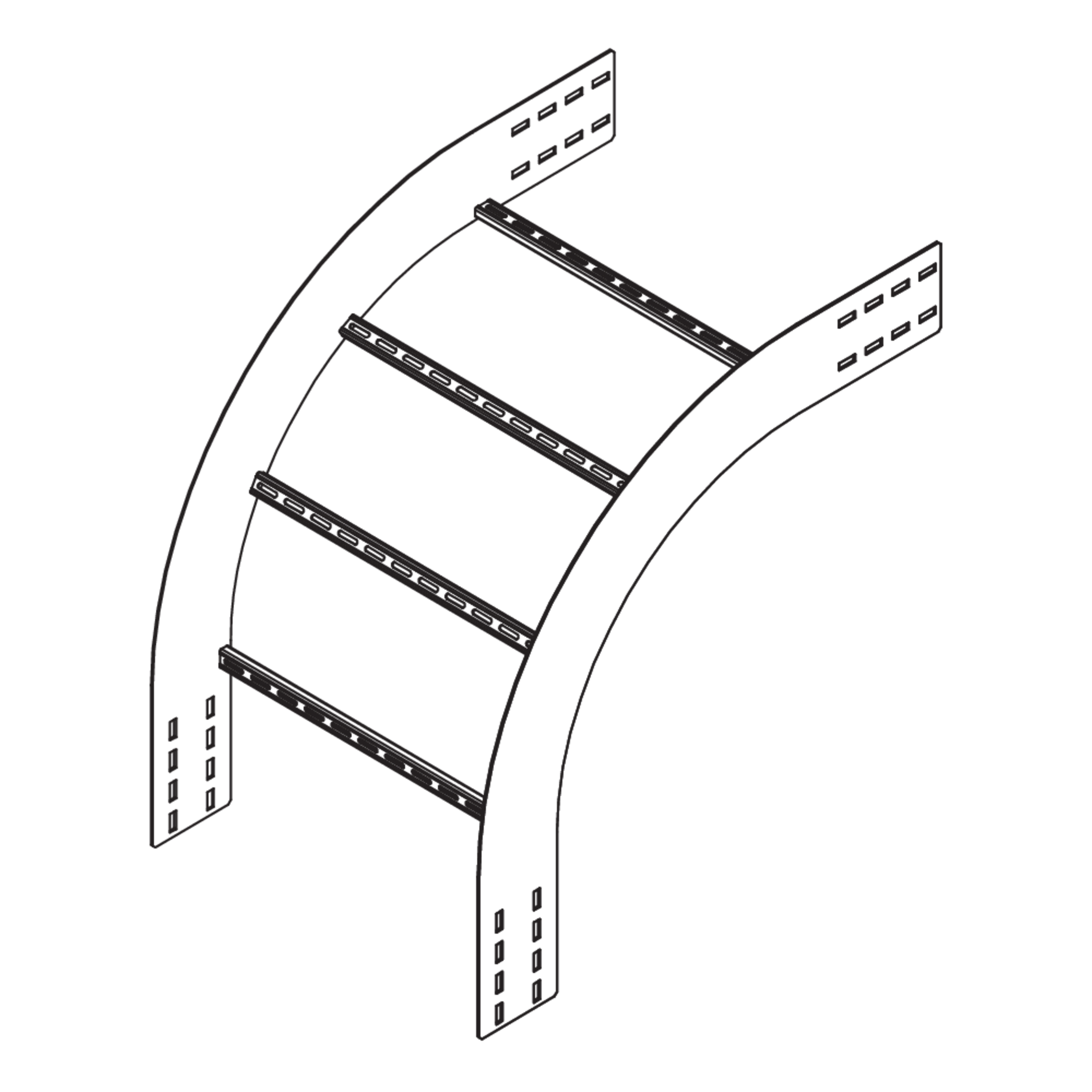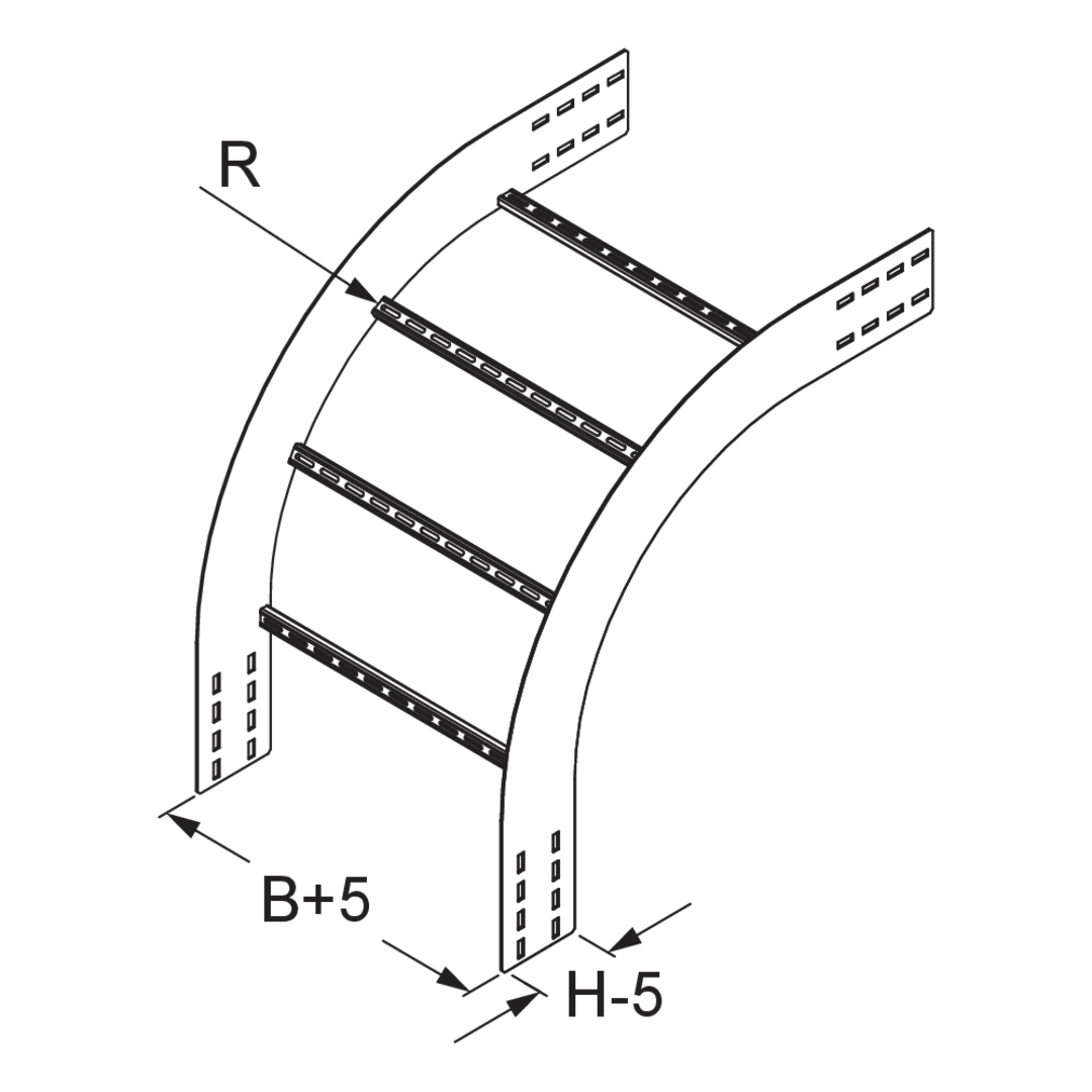 Wide-span cable ladder outside riserheight150 mmwidth600 mmradius470 mmDirection changevertically fallingAngle90°Weight per storage unit11.250 kgIncluded accessories