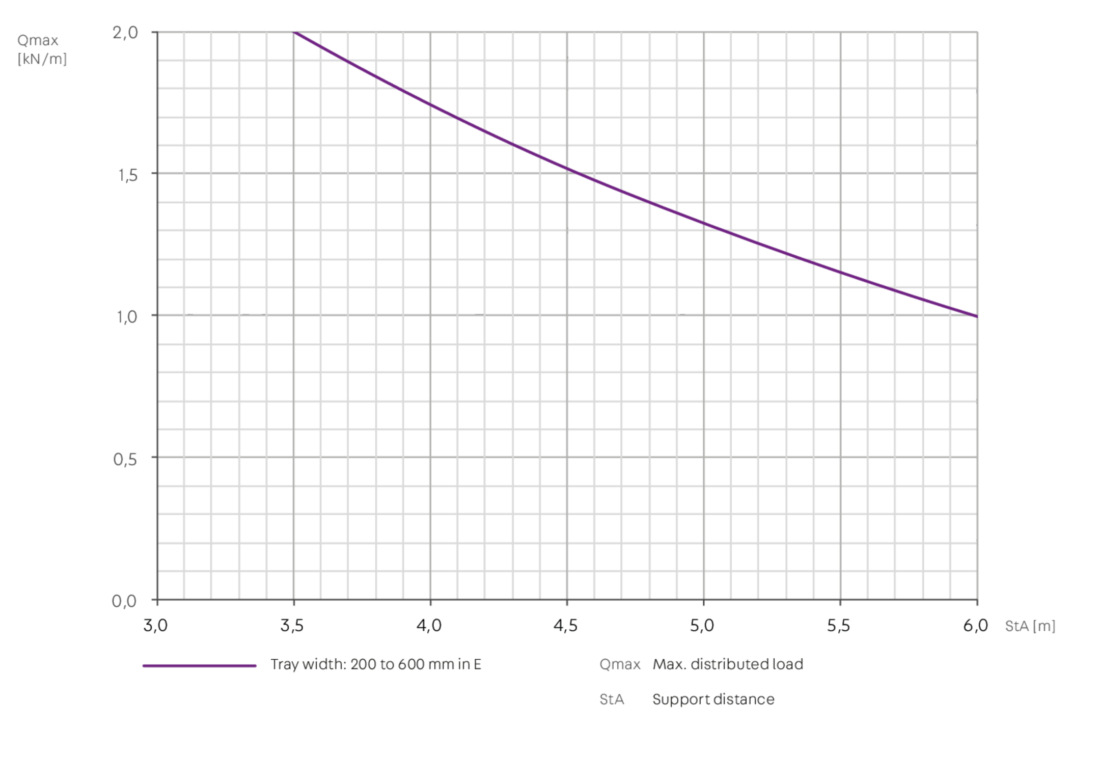 The wide-span cable trays WPR 100 have rails 100 mm high and are available in widths of 200 to 600 mm. The standard length is 6000 mm. The maximum load capacities can only be achieved by using the rail supports. The wide-span spar supports are to be used for fastening to the substructure. We provide components in various materials and surface finishes to ensure that various corrosion protection requirements for different areas of application are met.