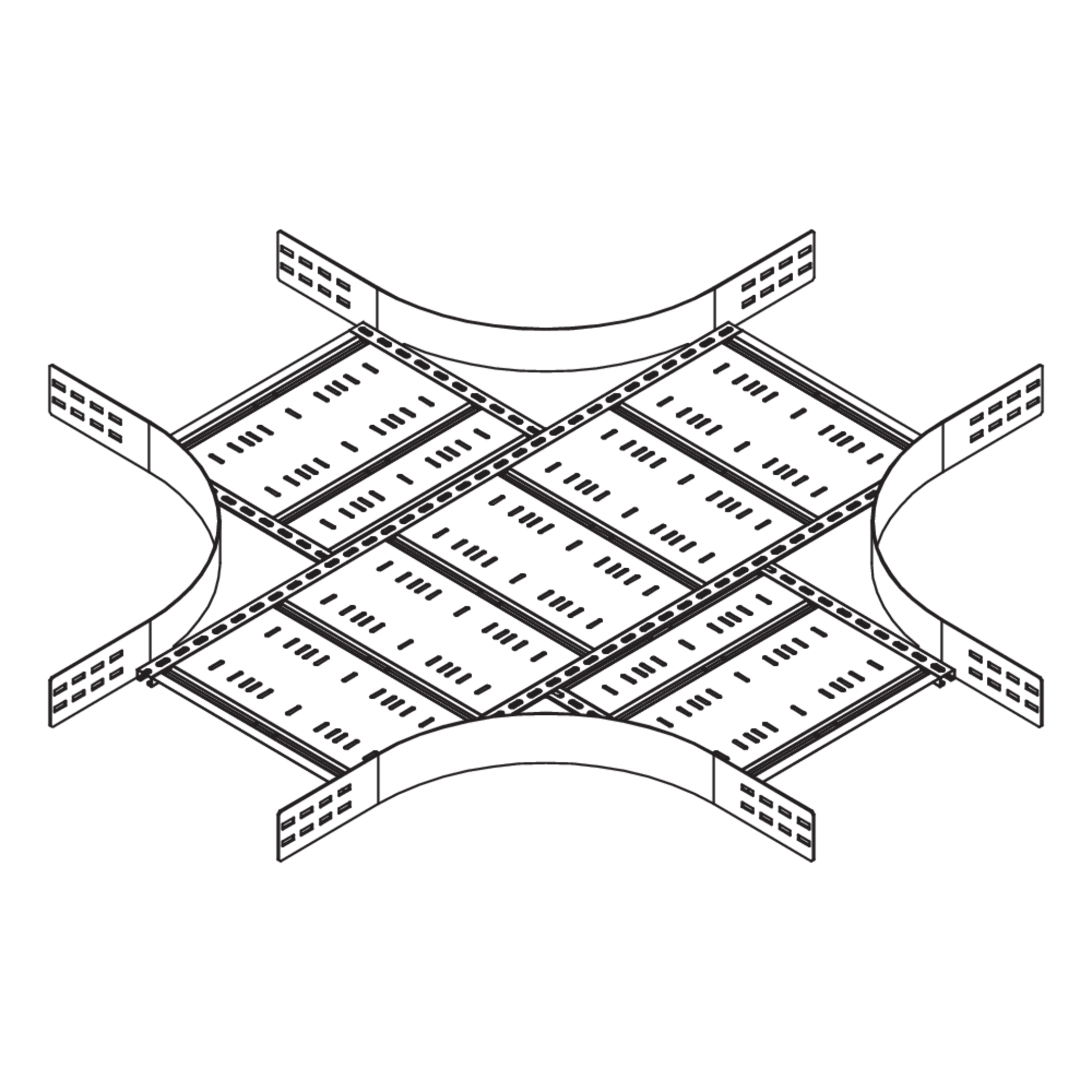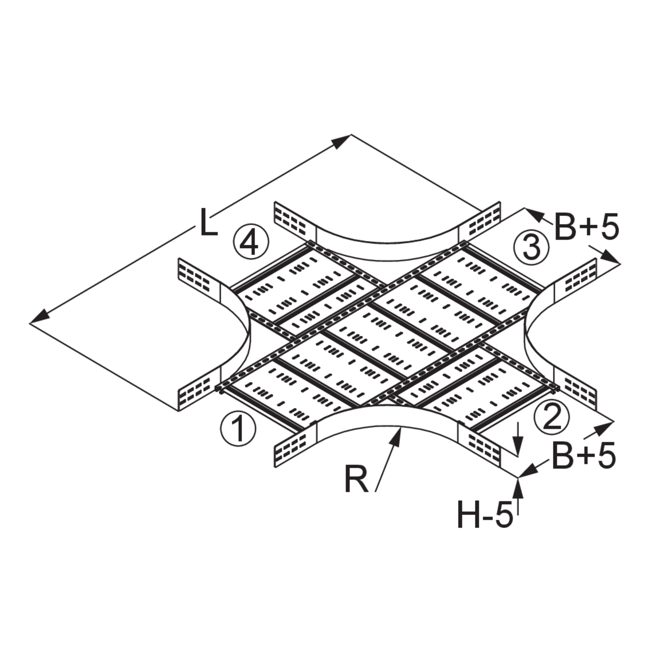The wide-span cable tray crossing WPRK 120 with integrated connectors serves as a formed part for horizontally intersecting wide-span cable trays. It is suitable for trays with rails 120 mm high and is 200 to 600 mm wide. The connection trays can be pushed in with a VB floor connector. We provide components in various materials and surface finishes to ensure that various corrosion protection requirements for different areas of application are met. Special designs with different connection widths ①, ②, ③, ④ or different radii R can be requested.